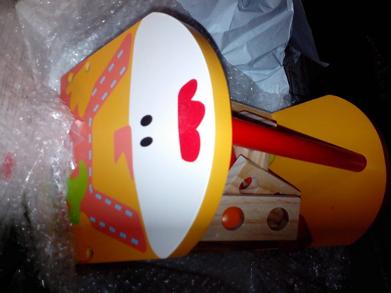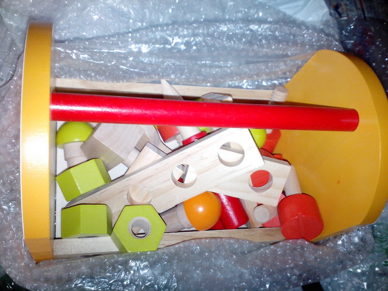 转眼间都半个月过去了,我的玩具还没到呢!后来热心的管理员小梦说我的地址不详细,快递被退会了,啊,我的地址一直没变过啊,小梦说最好再稍微改动一下,要不然一点没变人家还是不予管理的,我只好再改动了一下,终于在30号的中午刘师傅给我送来一个大包裹,提着还真是有分量呢!打开一看,包装的非常精致,包装盒上还有一层封闭的包膜塑料呢!打开盒子还有两层气泡塑料膜,终于见到小鸡工具箱的真面目啦,就像真的工具箱一样,造型逼真,侧面好8画着小鸡的图案,箱里有改锥,螺丝刀,螺丝,看起来都是高档的木质材料呢!色彩斑斓的颜色,惟妙惟肖的小零件,可以锻炼宝贝的动手动脑的能力哦,宝贝一定会爱不释手的!