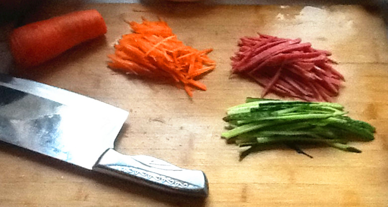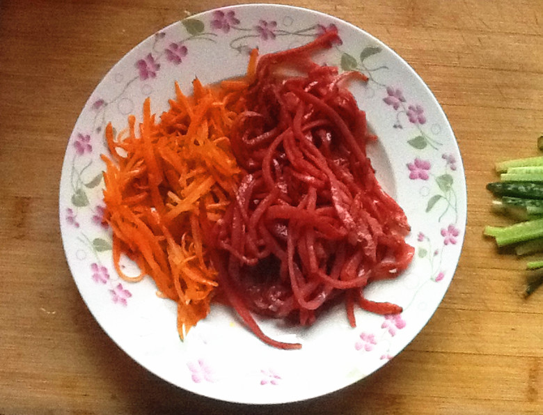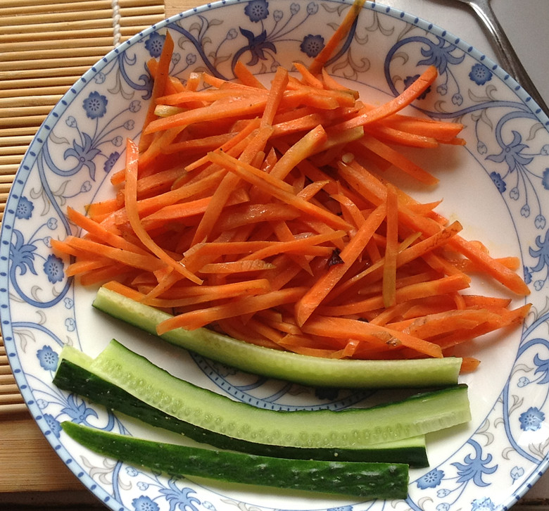 将胡萝卜、火腿、黄瓜切丝。 小孩子吃切细一些,大人吃就没关系啦!