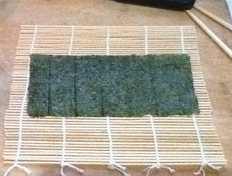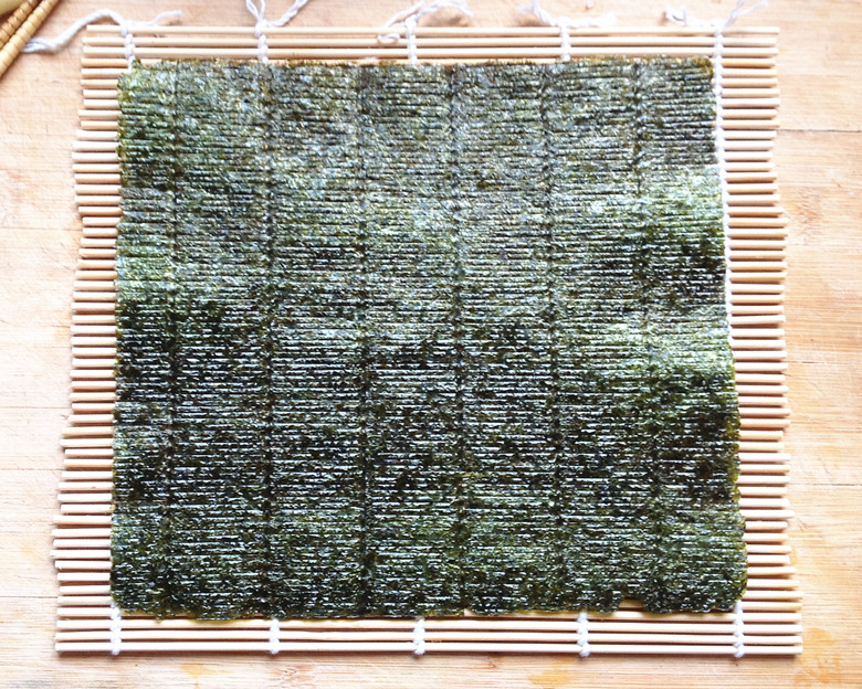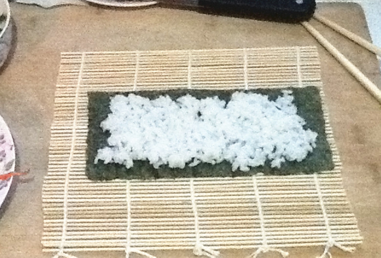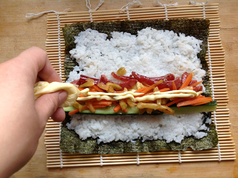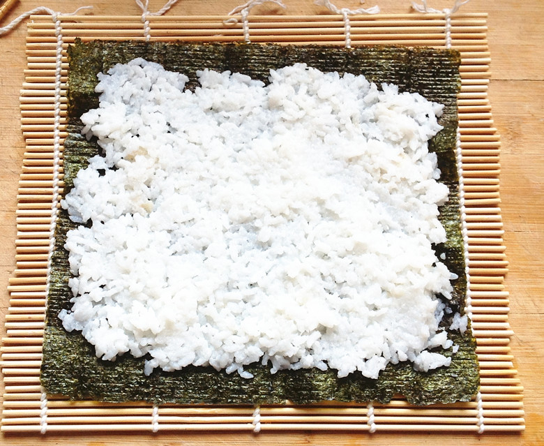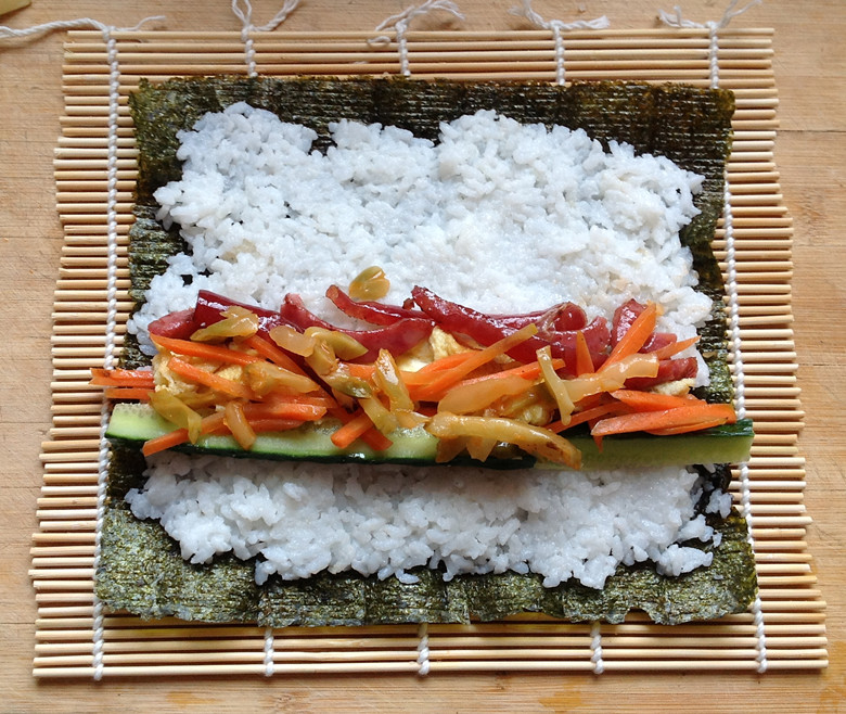 铺上米饭,加上宝宝爱吃的东西~~卷起~~