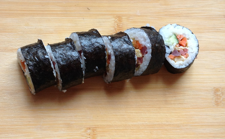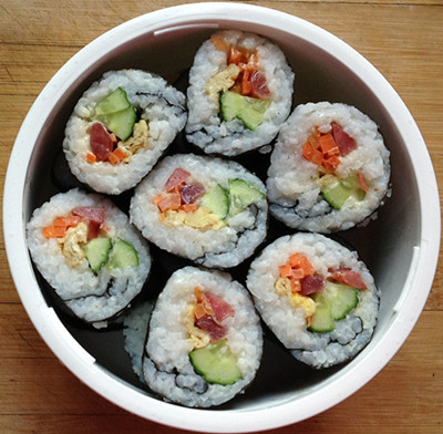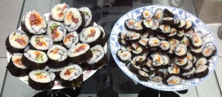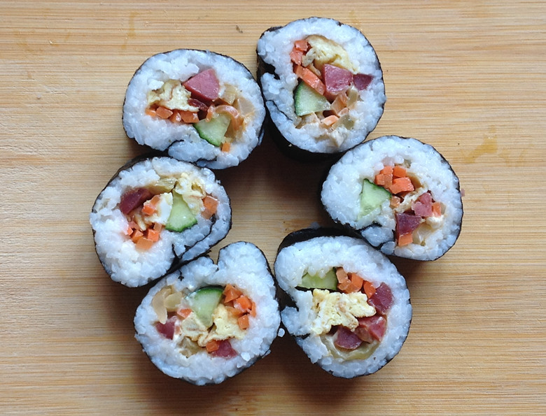 说起拿手菜啊,自从全职后我的厨艺还真是有所长进,不过与厨艺高超的亲们较之,我的水平当然还是相去甚远,参照物要选择正确哈,我只跟自己比哦!嘿嘿!一看我就是心虚啊! 小逗妈做菜,像炖鱼炖肉之类的还从来没有做过,最复杂的也只是做过丸子汤,还做的不太好吃,呵呵,肉类海鲜的我可能做的最好吃的就是油闷大虾啦,曾经得到过朋友们的一致好评哈!不过之前一个关系很好精通厨艺的朋友说过:要将虾做难吃了,实属难事!哈哈!所以,我也就不在这吹嘘自己的手艺啦!是人家虾同志本来就好吃的缘故啊! 素菜嘛,蒜蓉土豆丝啦,青椒土豆片啦,香菇油菜啦,丝瓜烧面筋啦。。。。。。哈哈,反正都是比较简单的啦!但是味道还算是不错滴!起码爱家孩儿他爹很爱吃!而且越吃越胖啊!哇咔咔咔!足够了! 那我今天要跟大家介绍个啥咧?其实也并非我很拿手,不过这个呢,我感觉很有介绍的价值,在我做之前我也没有想到这么容易还这么美味!而且出行郊游带上一份或者给亲爱滴他做一份爱心午餐都是很棒的选择哦! 是什么咧?那就是简单又美味滴寿司啦!叫做紫菜包饭亦可! 做完了才知道确实没有啥技术含量,简单又好吃!亲爱滴们不妨试试哦!呵呵! 上次带小逗去希乐城,一大早我起来做了好多!我和朋友加上小逗和小葵两个小孩,后来还有他们的同学和妈妈,三个大人三个小孩都没有吃得了!不是不好吃哈!是做滴太多了,大家都说好吃哦!