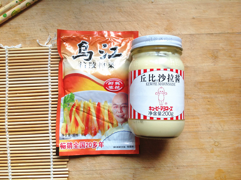 闲话不再多叙,开始介绍喽: (ps:照片有用Ipda2拍滴有用3拍滴!2拍滴不太清楚,请亲们见谅!) 配料:白醋、白糖、食盐、(可用寿司醋),沙拉酱,紫菜。 食材:蒸好的米饭,鸡蛋,胡萝卜,黄瓜,各种火腿,腊肉,榨菜。(可以个人口味选择) 辅助:竹帘,保鲜袋,刀,菜板。。。。。。 品牌可自己选哈! 乌江涪林榨菜,丘比原味沙拉酱