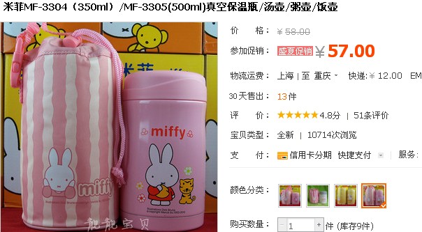![]() ![]() 因为我妹妹不懂怎么在淘宝上购买,只知道平时有事没事就在上面去搜索看看,反正她看好就叫我帮她也是一样的。这不,前几天又看上一个保温杯,说是现在她们单位都在拿那个保温杯来带饭的,我一看她要的那种我家有两个,在仔细一看,我家的原来是膳魔师的,要265一个呢,想着用来带饭就好像有点浪费了,还是让她买个便宜的用用吧。原谅我的私心,呵呵 ![]() 我家的就是这种了,全不锈钢的,上面盖子打开有个小的不锈钢勺子,盖子还可以做小碗用,因为这种是保温的,怕倒出来的汤水烫,倒在盖子上的小碗,冷点再喝的。 ![]() 而我妹妹选择的是这种,因为她要的是大的,500ml的,价格就是57+12=69了,还不是很贵 ![]() 我是特地叫发的韵达,第3天早上就收到了,速度呀。想着韵达是我们这里的快递中最快的,果然呀。 外面本来还有专门的纸盒子,我们在楼下时就已经打开看,就直接把纸盒子扔垃圾箱了,免得拿回家也麻烦。这是杯子的外包装盒子,看这个黄色,还因为发错货了,因为我是要的粉红色的 ![]() 打开一看,哈哈,正是我要的粉红色 ![]() 这个保温杯的口径比较大,所以有适合带点饭,反正现在的人吃饭都不太多的,呵呵 可以保6个小时的温,自己带饭去就差不多的 ![]() 还有配套的袋子,这个袋子也有保温的作用,里面加了一层隔热层的 ![]() 而且手提的带子也可以取下来的,放包里或者是自己提着都很方便的 ![]() 本来是叫罐罐来拍个照,谁知道杂这么严肃呢,又不是照身份证的照片,只是拍个照而已,可怜的娃,又被妈妈拉来出镜了。呵呵 ![]() 对了嘛,笑起来才乖嘛,就这样,继续保持了 ![]() 咦,才说了叫你继续保持笑容,杂又严肃了,这表情变化得还真快呀 ![]() 对哦,我们是要把这个你姨妈送去的,这是帮她买的 ![]() 后话;结果在当天下午5点过了,看着下午稍微小点了,想着人家急着要用,还是赶紧送过去了,结果罐罐还非要自己提着呢,说是他姨妈的,看看都走了很长一截了,想着他提着也热,还是我来提,他还不同意,最后还是我说,我现在先帮你提着,到了那里你再自己拿给你姨妈,我就说是你自己拿的,他才同意的。这小屁孩,还知道这样去哄他姨妈了,呵呵 本作品未经作者许可不得转载,转载请征求作者意见。擅自转载使用,将保留追究其法律责任的权利!