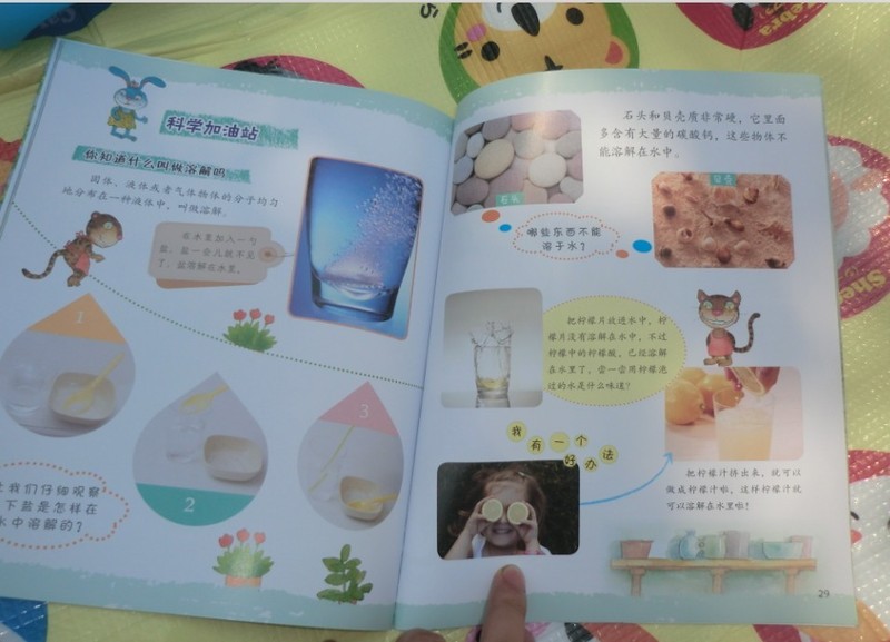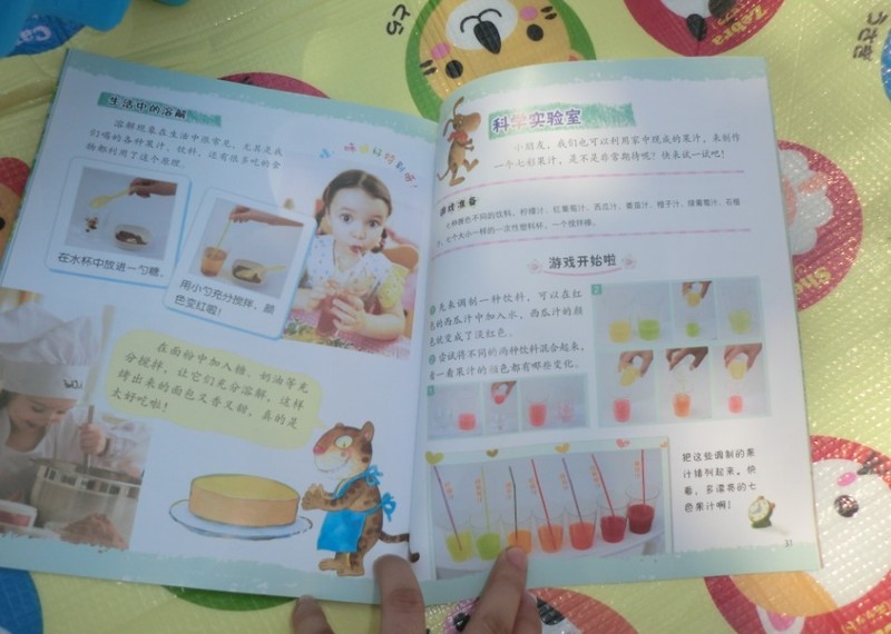 ![]() 一起来研究溶解的奥秘,亲身体验一下,就知道什么可以溶解,什么不可以溶解了! 记得自己小时候上学,最不喜欢那些所谓的科学课,因为学校把这个科学课列为副科,不是重点,所以大家都不重视,到了高中才知道自己关于科学的知识太贫乏了,直到现在都是这样,我的一些学生,根本就不喜欢学习科学,觉得没有数理化重要,可是我们当家长的一定要重视对孩子的科学知识的培养,这套 科学童话绘本,就是孩子们的最好的科学启蒙书,它是以故事的形式向孩子们解读生活中的一些科学现象!非常的有趣! ![]() 这套书一共有6本,分别是 讲溶解现象的《当当猫过生日》!讲磁铁额《一块有魔法的石头》,讲触觉的《圣诞老爷爷的礼物》!讲沉浮的《皮皮狗找泡泡》!讲物体的弹性的《淘气精灵吃弹性》,听,每一本的书名都是这么的有趣,真想赶紧打开书一起读一读!看看这些有趣的故事里面到底蕴含了什么科学现象! ![]() 书的作者是中国的美女作家!苏梅老师,她是中国作家协会的会员,中国作家协会研究会理事!发表了很多的长篇小说!很多儿童小说都是获得获大奖,深受孩子们喜爱的,我小时候就非常喜欢读苏梅老师的《喷火小雷龙》!现在我的宝贝又来读苏梅老师的书,真的很感慨,好书是经久不衰,是可以教育影响好几代人的! 非常有幸收到了这套书的第一本《当当猫过生日》,这本书讲的是溶解的现象! ![]() 美好的人生从幸福的童年开始,要孩子幸福 首先妈妈爸爸要幸福!幸福不是金钱可以买来的,幸福就是孩子有个会给自己讲故事的爸爸妈妈,有一个愿意陪着自己慢慢成长的父母!有好书读,有好故事听! ![]() 故事开始了,可爱的当当猫要过生日了,大家都要来祝贺,大家都带来了漂亮的礼物盒,盒子里面是什么呢?相信当当猫也和你一样特别的期待吧! ![]() 妈妈为小伙伴们做好吃的蛋糕,大家都在围观,猫妈妈是如何把面粉,鸡蛋水,变成好吃的蛋糕的! ![]() 把揉好的面放进了烤箱,定时,就等着吃吧~!看看小动物们的期待的表情哦!真是可爱! ![]() 哇漂亮的蛋糕出炉了,好好吃,大家一起吃蛋糕吧! ![]() 好甜,好香啊,面包为什么是甜的了,没有见到猫妈妈往面粉里面放糖啊!真奇怪啊! ![]() 哈哈,猫妈妈真的会变魔术吗?哈哈,原来是揉面的水是放了糖的,怪不得呢! ![]() 糖放在水里,还要不断的搅拌,糖变得越来越少了!但是水却变得越来越甜了!糖跑到哪里去了呢?原来是溶解到水里面去了,这里书上把溶解二字都是用放大的红色字体标记出来,这样孩子跟容易看到,更容易理解! 当然不是所有的东西都可以溶解在水里的,还有很多的东西是不可以溶解的哦! ![]() 听完好听的故事,我们一起来科学加油站来亲自动手做实验吧,盐和糖一样都是可以溶解到水里的!但是石头是不可以的哦!当然还有更多的东西,大家可以亲手去试试! ![]() 除了溶解,我们还可以做一些科学实验的游戏,一起来做七彩的果汁,是不是很有趣呢,书后面的这些实验的设计,让孩子更加的喜欢科学,并且养成了吸魂自己动手去实践的好习惯哦! ![]() 看看我的酸梅粉有没有充分溶解到水里呢,再加一点儿糖,他们都一起溶解了! ![]() 阳的酸梅粉和糖都放得太多了,都溶解不完了,下面有厚厚的一层没有溶解!“阳阳,你的水已经达到饱和了,不能再溶解了~!”“宝盒,什么宝盒,是放宝贝的盒子吗?”阳阳惊讶的问我!哎呦我的妈呀,这中国的汉字就是神奇,同音字就让阳误解了!“不是宝贝的盒子,是你的水已经不能够再溶解任何的糖了,水已经吃饱了糖,足够了!”不过妈妈不要着急,这只是科学的启蒙,更多的只是等着孩子上初中以后再学,但是我们可以稍微引申一下哦! 本作品未经作者许可不得转载,转载请征求作者意见。擅自转载使用,将保留追究其法律责任的权利!