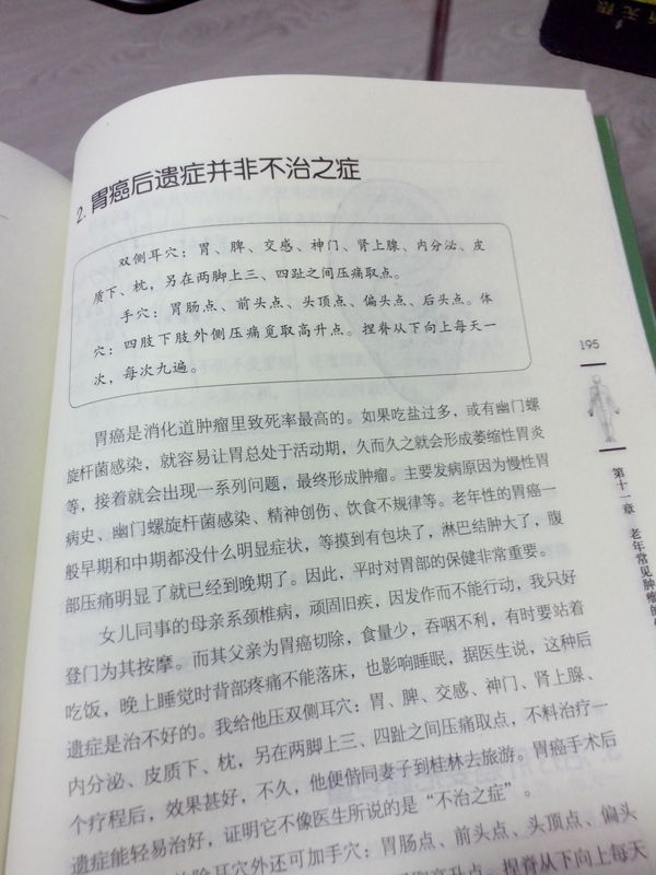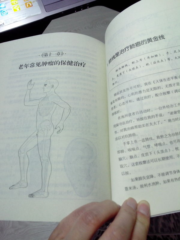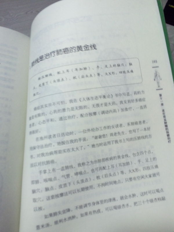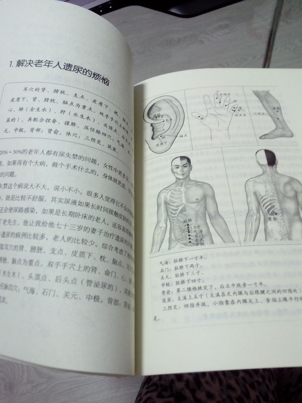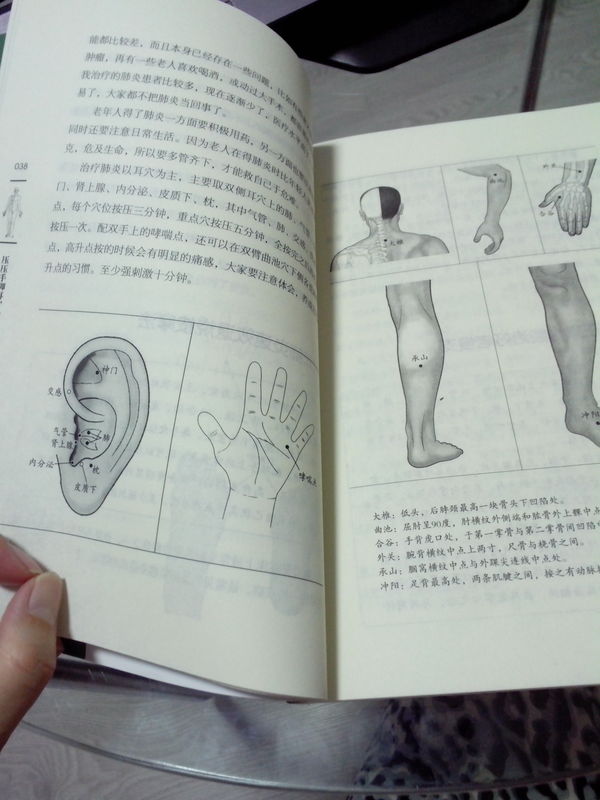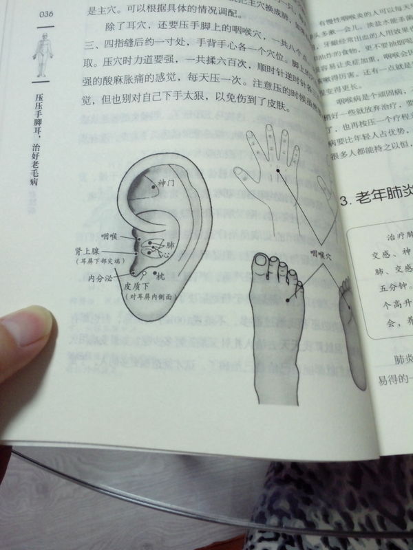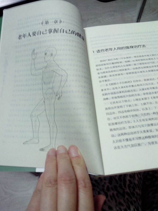 现在来说下书的一些具体的内容,整本书对各种老年病都介绍得很详细,对于各种疾病主要是配以中医的按摩手法来治疗,作者自创的人休X形平衡疗法是在长期实践中创造出来的治病方法,人体X形平衡法是用火柴棒、小木棒、牛角棒、手指等按压穴位的方法,非常适合老年人使用。方法简单易懂,便于普及和推广,只要有足够的耐心和信心,便会有显著的疗效。 书中对各种疾病的治疗基本上都是以按压穴位的方法来治疗,所以好好读这本书肯定是有用的,因为我们都知道我们身体的各个穴位都代表着身体中不同的器官,书中详细地说明了怎样去按压穴位并且配图说明每个穴位的准确位置,简单易懂,易学易会。有防治感冒一压灵,压压耳穴就可治疗慢性咽喉炎等很普通的小毛小病,也有治疗肝癌要把握轻重、腹部按摩对大肠癌有好处等重症疾病的治疗方法,同时又把男女易得的病分类讲解得很清楚,基本上老年人能得的病在这本书上都能找到治疗的方法和按压的穴位,我想应该是老年人必配的一本书。 老年人的健康是全家人的福气,身体健康才有幸福的晚年,子女才能安心地工作,健康的密钥就在我们的手脚耳上,只要动动手,就能有个乐活的晚年时光,这是这本书的后序箴言,我觉得很有道理,在这里也希望全天下的老年人都能有一个健康幸福的晚年!要想好好介绍下这本书的内容我想单凭文字还真不好介绍,因为几乎每页都配了些穴位图来辅助讲解,所以我觉得如果可能,老年人们或者子女们可以去购买一本,自己来阅读,边阅读边配以实践,应该是最好的!现在就简单配图介绍一下这本书的一些个内容! 下面是这本书的一些插图及内容介绍! ![]() ![]() ![]() ![]() ![]() ![]() ![]() ![]() ![]() ![]() ![]() ![]() ![]() ![]()