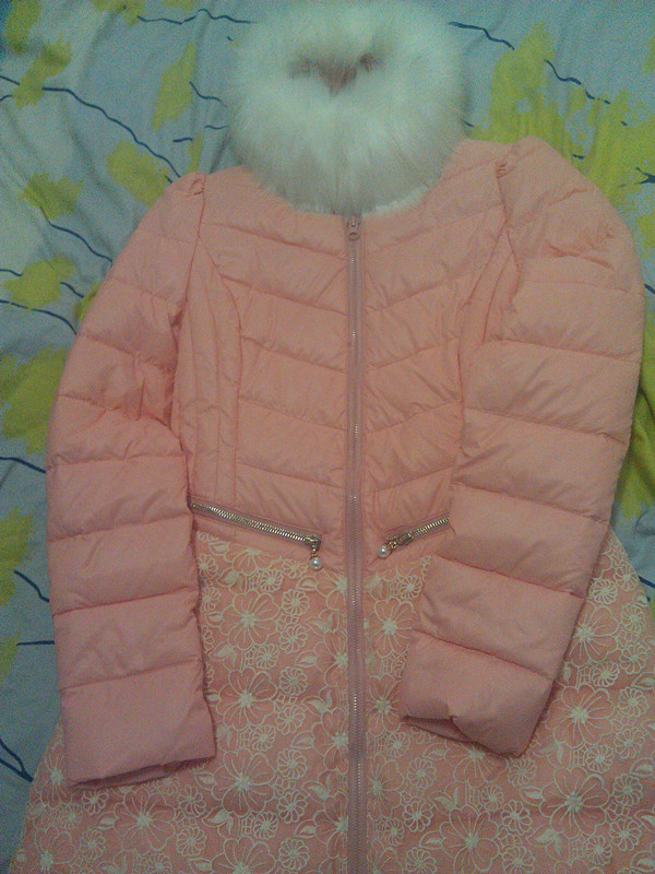 羽绒服的颜色很漂亮,点点的帽子好特别
