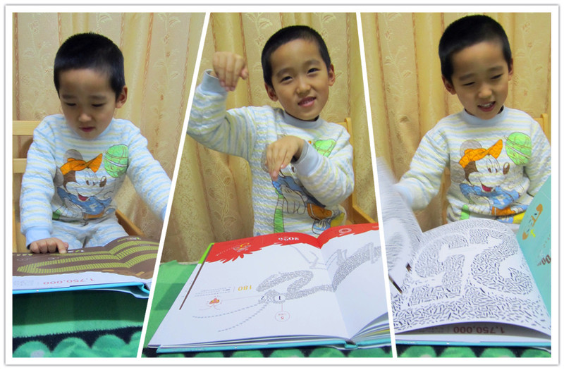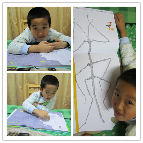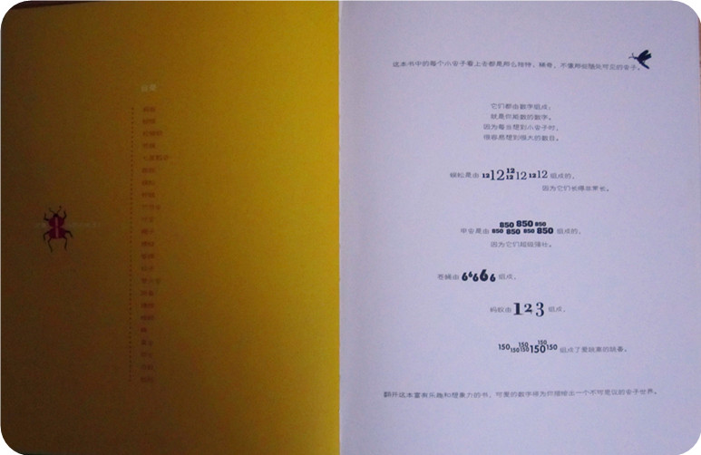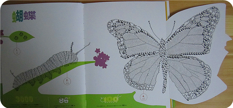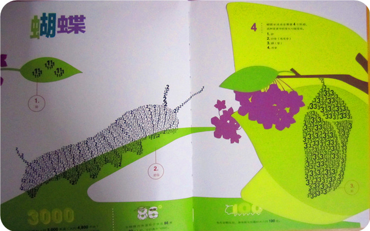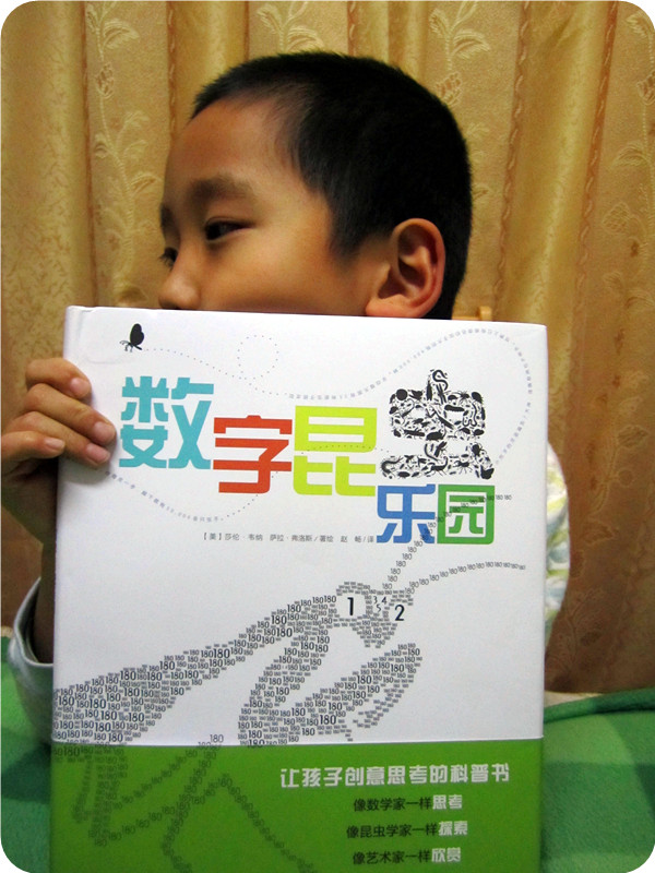莎伦▪韦纳 萨拉▪弗洛斯/著绘 赵 畅/译 《数字昆虫乐园》在我没有看到这本书之前,对于数字和昆虫之间的关联,真的无法想到什么?一颗像0一样的卵,一些数字罗列的讲解,一种昆虫的寿命是多少年,一次繁衍多少后代,也许,也就是这样吧!或许在我已经模式化的头脑中再也找不到什么新鲜的注解和关联了。直到,我们拥有了这本书,让我在陪同小娄读书的过程中,不断的在脑子里惊叹着:居然还可以这样!居然还能够这样!…… 第一次,我匆匆翻阅了这本书,看着一幅幅有数字密密麻麻组成的昆虫,第一感觉就是震撼,真的很佩服作者是如何想到的,用数字,不同的,大大小小的数字组成了一幅幅栩栩如生的昆虫画面,而且书中时不时出现的翻拉页,也为阅读增添了不少的乐趣,我当时就猜想着小家伙一定喜欢这本书,不止因为这里有他喜欢的昆虫,有变化莫测的翻拉页,还因为这里有小小的,一行行看着神秘莫测的小字,说实话,这些字我看起来都有些费事,不过我想这个一定能成为宝贝的大爱! 带着最初的肯定,和宝贝一起用几天的时间阅读完了这本书,在这个过程中快乐很多很多,笑声不断,如果一本科普书能看出了笑点,那能说明什么呢?我们演绎的有乐趣?不!那说明这书做的太成功了!让孩子从中找到了乐趣,找到了看下去的动力,找到了看出来的快乐!经过我和宝贝的细细研读,我们发现了这本书几个特别好的地方,和大家分享下吧! 一、数字的巧妙运用 在我们接触的数字中,除了计算,似乎数字就没有什么特别的用处了。唯一让我们觉得不同的就是计算机中的1和0了,可那似乎又离我们很远,毕竟打开电脑我们看到依然是文字,而不是1和0的组合,而这本书中的数字真的改变了我们原本的认识,原来数字还可以作画,而且居然能画得如此逼真。数字在这本书里被运用的如此的灵活,别以为每个数字都只是作者绘画的一个小元素,不止这样,细细的看来,每种动物运用的数字都不简单。