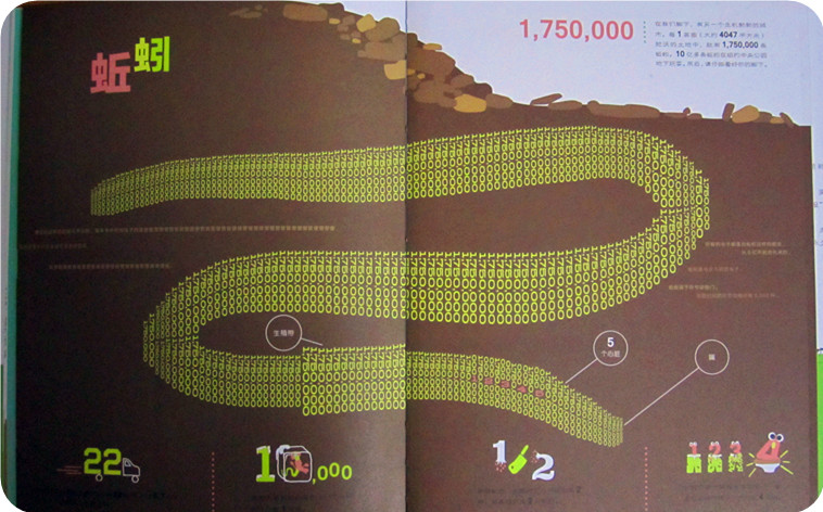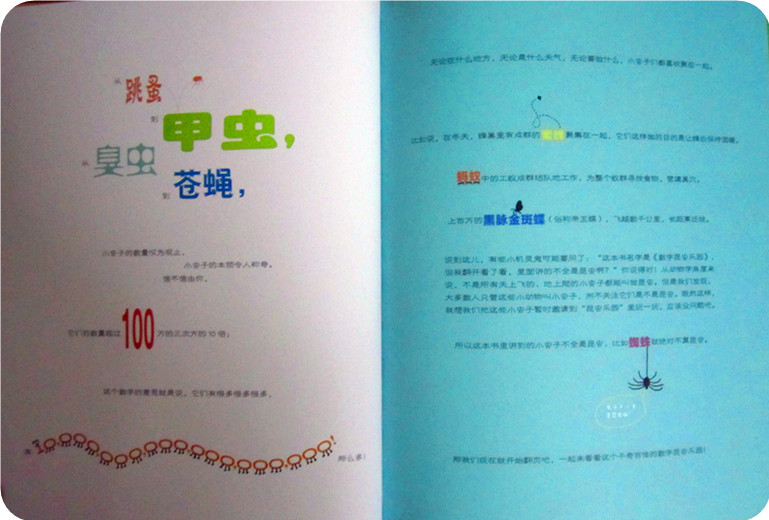 这应该算一本科普书吧!毕竟里面有很多关于昆虫的知识,可科普书能写得如此有笑点,这还是我们从未经历的。你能想象,一只平均每天打盹250次的工蚁是怎样的生活吗?小家伙为我快乐的演绎着睡睡醒醒的工蚁。 请听题,一只雌苍蝇一生大约产1000枚卵,其中雌雄各半,而在条件适宜的夏天,苍蝇能繁殖12代,那么到夏天结束,九月份时,一只苍蝇会变成多少只苍蝇吗?算出来了吗?算不出吧!哈哈……告诉你是489乘以10的54次方。小家伙不知道10的54次方是什么意思,我告诉他,就是数字1的后面有54个0。小家伙瞪大了眼睛,54个0,那要都写出来不得占一页纸啊!呵呵……是呀很多很多,到那时一只苍蝇会有儿子、孙子、曾孙子、曾曾孙子、曾曾曾孙子、曾曾曾曾孙子、曾曾曾曾曾孙子……小家伙看着我曾起来没了完,乐得前仰后合的。 不过这个可不是我独创的,后来讲到蚯蚓时,就说到蚯蚓是原始环节动物,是本书中所有虫子的曾曾曾曾曾曾曾曾曾曾曾曾曾曾曾曾曾曾曾曾曾曾曾曾曾曾曾曾曾曾曾曾曾曾曾曾曾曾曾曾曾曾曾曾……曾祖来着,哈哈哈哈……有意思吧! 四、形象的比喻,让你惊叹不已!
