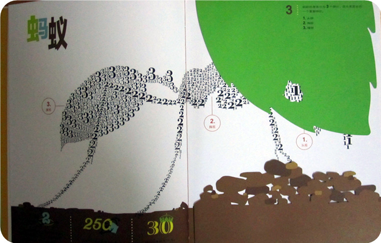 比如蚂蚁中运用的三个数字,1、2、3。蚂蚁,不不止是蚂蚁,应该说昆虫的身体都分为三个部分,有头,胸,腹三部分,在这里作者用1、2、3分别画出了蚂蚁的这三个部分,用数字”1“画头部,用数字”2“画胸部,用数字”3“画腹部。那你知道蚂蚁的六只脚属于哪个部分吗?看看用什么数字画的脚吧!哈哈……很容易发现吧,他用的是”2“他说明,蚂蚁的脚属于胸部!是不是很神奇啊?