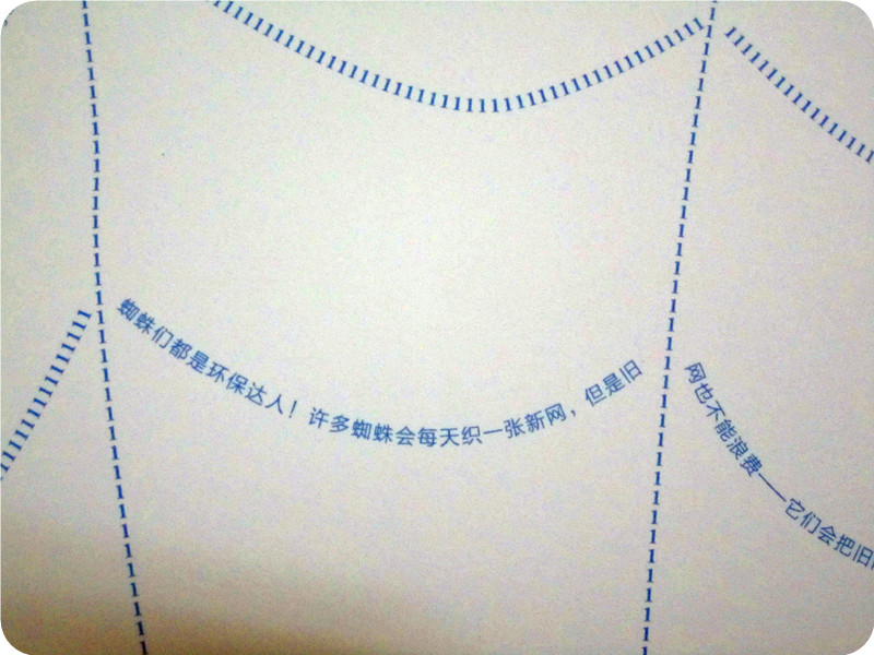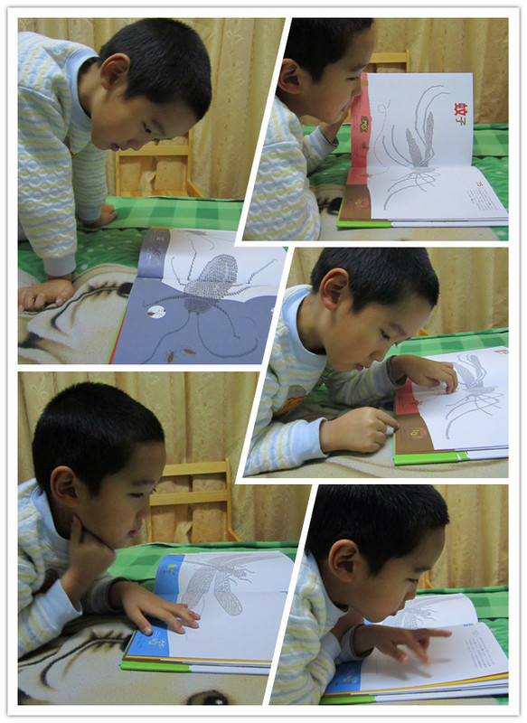 在这本书中,还有一处特别的设计非常受小家伙的欢迎,这也正是我在最初看到这本书时,觉得宝贝会喜欢的部分,那就是那些如蛛丝,如昆虫足迹……的小小的文字,小家伙细细的读着那小小的文字,每次都好像发现了天大的秘密。整个人都趴在了书上,时不时的调整着方向,来适应不断转弯变化的文字。小家伙说,他就是一个大侦探。是呀,就像一个大侦探,在探寻着关于昆虫的种种谜团! 三、幽默的科普,让人忍俊不禁,笑破肚皮