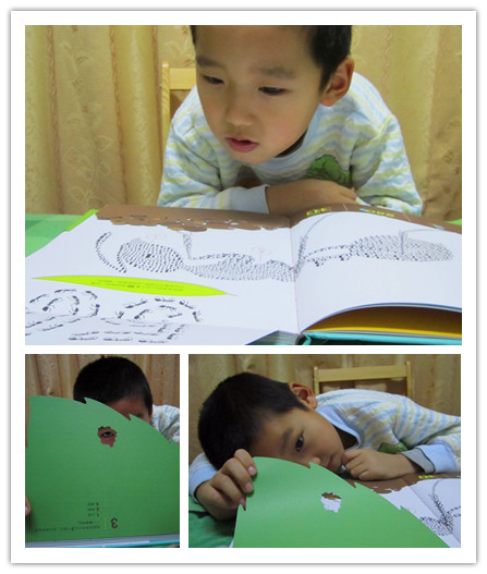 而蝴蝶中1234的变化就是蝴蝶从卵到幼虫到蛹到蝶的变态发育阶段。清晰明了,让人过目难忘。 二、阅读形式的巧妙变化 对于孩子来说,精彩的故事很具吸引力,美丽的图画更具吸引力,可要是和充满变化的镂空页,翻拉页相比,似乎就要逊色很多。孩子毕竟是天生喜欢玩,喜欢新鲜的,翻开合上不同的变化,看着镂空处露出的点点讯息,处处都充满了神秘,处处都充满了新奇。看到这样的设计,哪个孩子不想伸手去摸一下,去翻一下!而当孩子伸出手去探索它时,他就已经被书吸引住了!