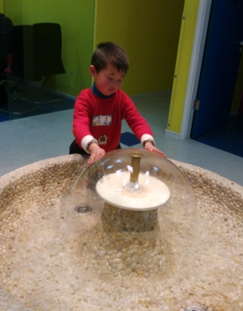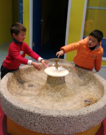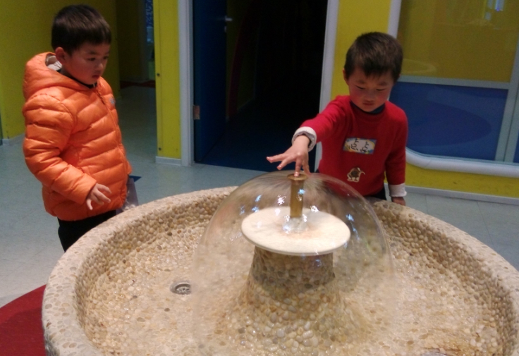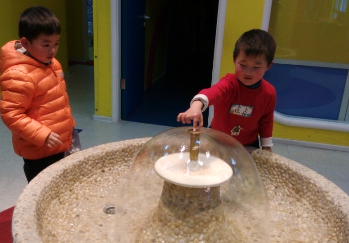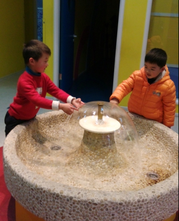 然后点点就和另一个同学一起玩这个水了,两人一开始只敢用手指点一下,然后慢慢大胆起来,拍拍水,拿手捧起水,洗洗手,玩了一会儿,点点就说洗干净了,我们一起回家吧。也许这样的小喷泉水池也是为了吸引孩子吧,让孩子更有探索的欲望吧。