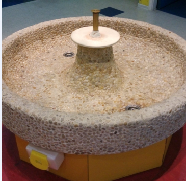 上课结束以后,就带着点点来到这个水池旁边,我让点点自己看,这是什么,点点说是石头蘑菇,还真有点像呢,我去打开开关,水就出来了,向四周喷洒,点点说原来是个小喷泉,还可以洗手呢,我说这就是洗手的,点点说我还是第一次见过这样的洗手池,很好玩。
