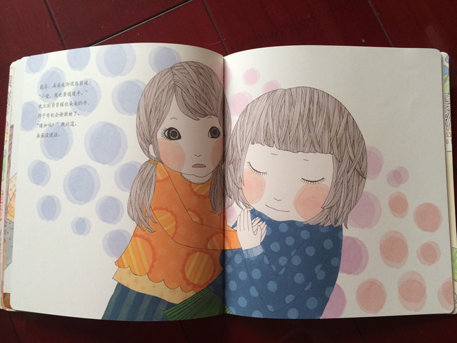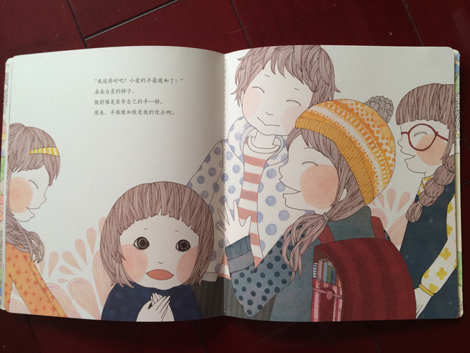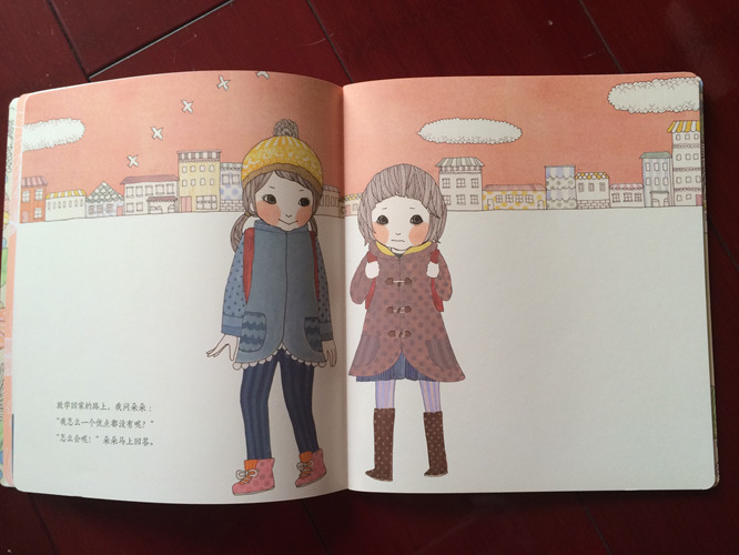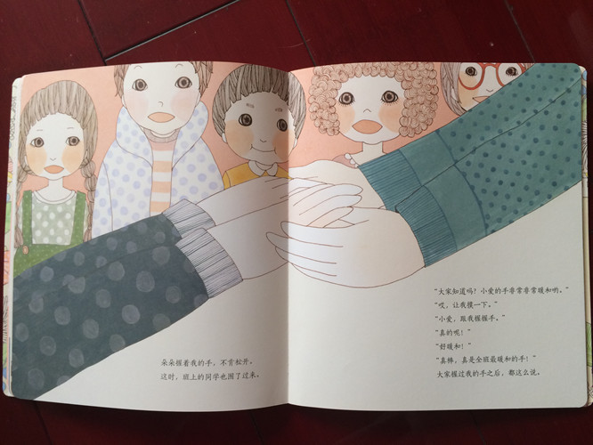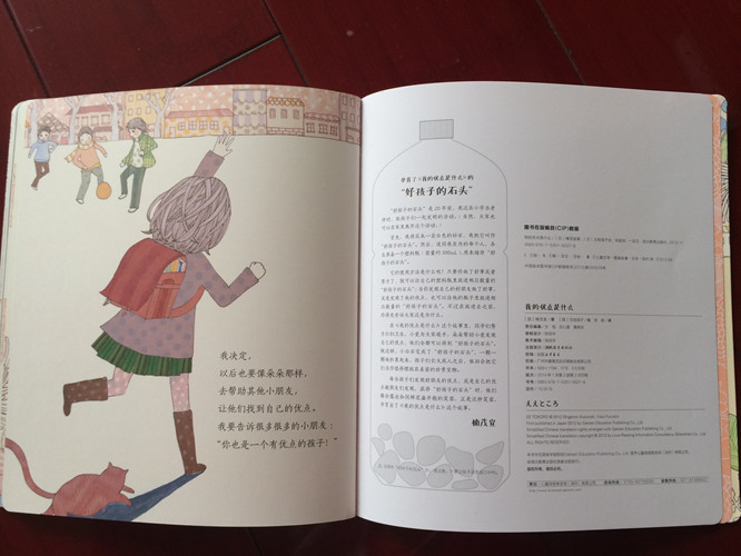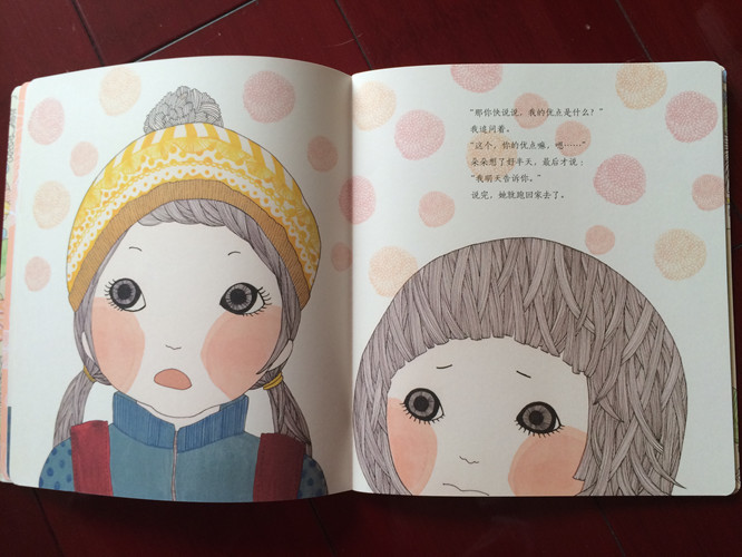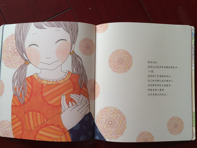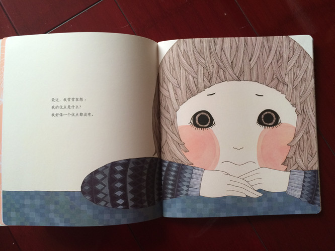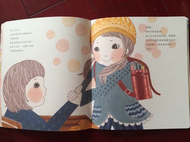 ![]() 收到书,第一眼就被书的封面吸引,一个漂亮的小女孩。在看故事内容,更是让我动心,让我想起自己小的时候,这个小女孩的故事,有些自己小时候的影子。记得小时候,我就很像故事中小女孩一样,很想被人认可,很想被人喜欢,被人欣赏。可是很多时候,都是没有人帮忙,没有被认可,然后独自的去成长,去摸索。很庆幸这个小女孩遇到一个热心的同学,让她被认可,让她知道自己也是可以帮助别人的。那么很希望这个故事,能给我的孩子美妞一些提示。 《我的优点是什么》画面温馨,色彩柔和,每个小女孩就如同身边的孩子一样。故事内容就是身边孩子发生的故事,一点一点深入,一点一点带我们找寻解决问题的方法方式。 读故事之前问美妞:你的优点是什么?美妞说:就是敢于说话。那么你的缺点是什么呢?我的缺点就是爱动不能坐下来。 哦,这个优点和缺点,都是妈妈平常对美妞说的话啊。 怎么还把这个当优缺点了呢?那么看来时不明白,那么我们一起来读《我的优点是什么》来明白吧。 ![]() ![]() 大眼睛娃娃头的一个小女孩常常在想,我的优点是什么呢?这个小女孩叫小爱。小爱个子矮,力气小,跑步慢,就连说话的声音也小,100分,从来没有得过。一个很普通,很平常的小女孩。 ![]() ![]() ![]() ![]() 在放学的路上,小爱问朵朵:我怎么一个优点都没有呢?朵朵告诉她,每个人都有优点。当朵朵回家想小爱的优点时,小爱非常伤心,觉得自己真的没有优点,可是第二天早上,朵朵告诉小爱,你的优点就是你的手特别暖和,是全班最暖和的手。小爱终于知道自己的优点了。 ![]() ![]() ![]() ![]() 朵朵握着小爱暖和的手不肯松开,班上的同学都围了过来。朵朵告诉班上的同学:小爱的手,是全班最暖和的手,非常非常暖和。这样班上的同学都来摸小爱的,然后都觉得小爱的手真的是特别特别暖和。 小爱终于知道自己的优点了是小手特特暖和。朵朵为此也很自豪,因为是她发现了我的手暖和。 有一天打扫卫生后,洗过抹布的同学都来找小爱暖手,因为水太冷了。大家一个一个把手放到小爱的手里,小爱一个一个的帮大家暖和手。小爱非常高兴。当朵朵来让小爱暖手时,小爱立刻紧紧握住朵朵的手。可是小爱的脸变了。 ![]() ![]() ![]() 小爱问朵朵:你暖和了吗?朵朵很难为情的告诉小爱:你一直为大家暖手吧,现在你的手有些凉。听到朵朵的话。小爱又开始伤心,觉得自己的优点没有了,眼泪开始大滴大滴的流了下来。就在这时,朵朵却告诉小爱,我发现你了更棒的优点,自己的手都不暖和了,却还在拼命的给大家暖手,你能为别人着想,这才是你最大的优点。 ![]() ![]() ![]() 两个小朋友冰冷的手就这样握着,可是朵朵暖心的话,却让这股冰冷开始融化,小爱又哭了。因为小爱明白一个道理,能够为他人着想的人是朵朵,是朵朵教会她明白,去帮助其他小朋友,让他们找到自己的优点,并且每一个人都有自己的优点。每一个孩子都是有优点的孩子。 小爱的故事,其实就是我们身边每一个孩子的故事,孩子一点一点长大,那么所经历的事情,都是第一次,第一次叫爸爸妈妈,第一次会用勺子,第一次学会走路,第一次向你表达爱你,第一次得到奖状,,,,,,,,很多的第一次,都是在我们大人或是其他小朋友的肯定下得到的。那么学着做朵朵,多肯定我们的孩子,多认同我们的孩子,哪怕是一点微不足道的事情,都会让孩子自信起来,都会让孩子认同自己,肯定自己。让孩子拥有一颗阳光温暖的心。 同时《我的优点是什么》也让我自己非常喜欢,喜欢整个书的温馨画面,大眼睛的娃娃头,小时候的自己。故事简单,却让你很回味。一遍一遍读来,细细品味。虽然是儿童读物,但是传递的确实一个正能量,关爱他人,也是在关爱自己。学会欣赏别人,也是在认同自己。