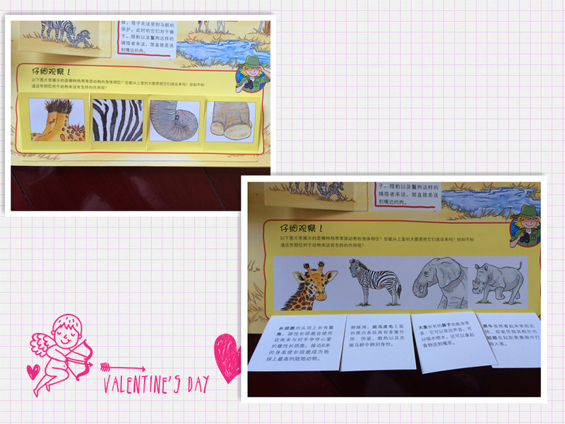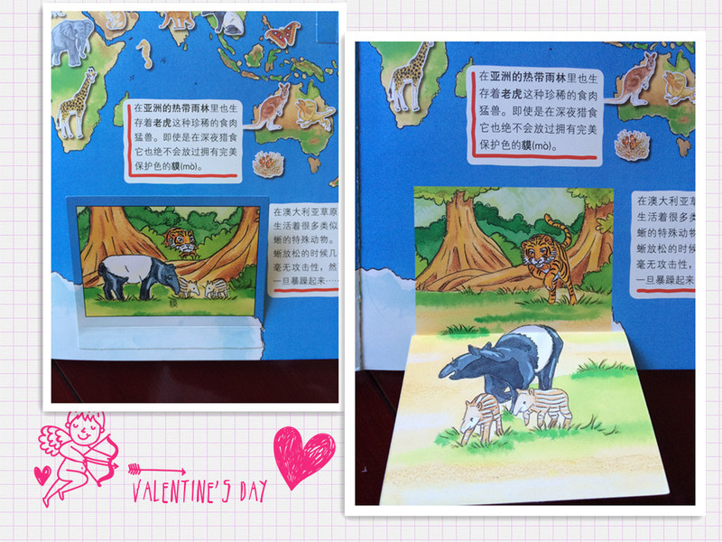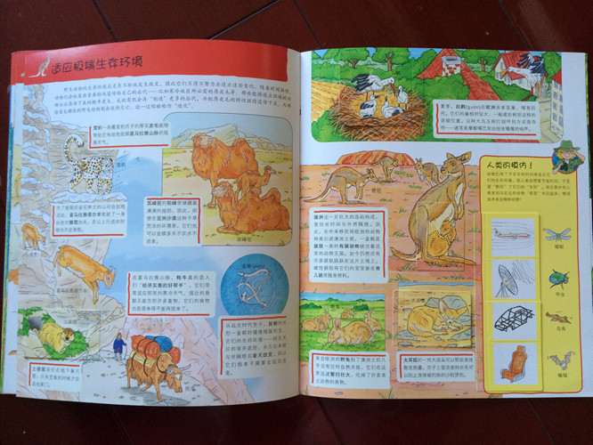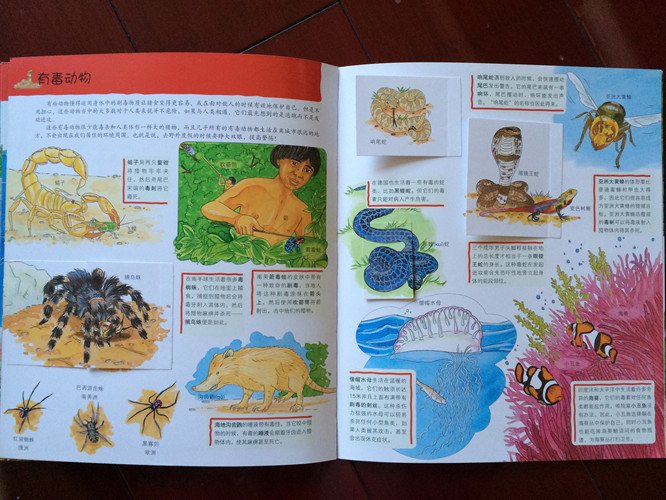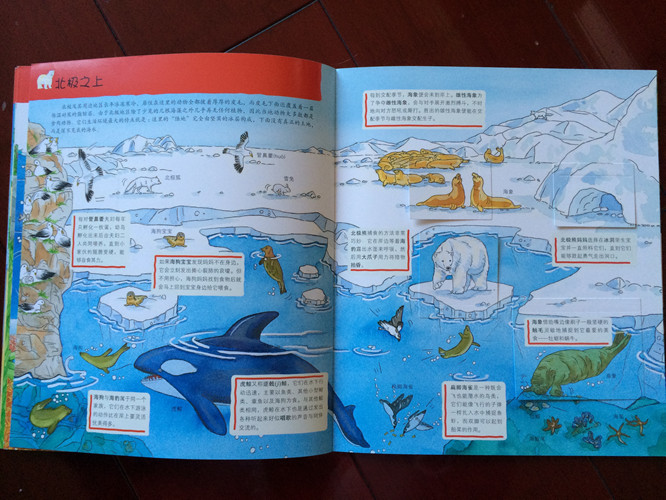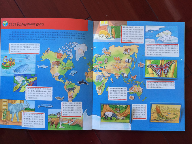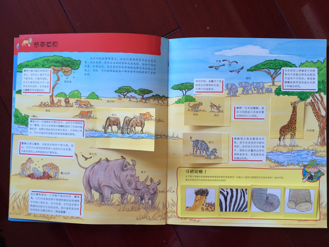 ![]() 动物是与我们息息相关的共同生存在这个世界的一份子,它们像我们一样会呼吸,有着生命。电视经常会播放《动物世界》来讲述动物的各种事情,动物的起源,动物的猎食,动物的自我保护,,,,,让我们来了解动物的世界。让我们知道,除了会呼吸的我们外,还有一群跟我们一样的生物体,它们也是需要保护的。 经常在小区内,看见各种狗类,孩子很是喜欢,并且家里还养着小鱼,小乌龟。这些让孩子看见的都是我们可以看见,可以接触到的动物,它们没有攻击力,甚至养时间长了,和我们会有感情,小动物生病了,我们也会跟着着急,尤其是养了很长时间的小鱼,要是突然死去,更是觉得伤心。每每去喂鱼食,先去敲桥玻璃,就看成群的小鱼都会游过来,然后等着你喂食。这种心情就像是你给自己的宝贝喂东西一样,高兴幸福。 今天给美妞要读的书《野生动物》就和家养的动物不一样了,他们生活在野外,完全靠自己的能力生存,靠自己的本领存活于大自然中。《野生动物》是好聪明情境认知翻翻书其中一本。好聪明情境认知翻翻书一共8本书。神秘森林,野生动物,我的身体,我们的地球,恐龙王国,开心农场,疯狂海盗,宇宙空间。 翻开《野生动物》这本趣味与知识相结合的书,孩子像是打开了动物世界的大门,在里面挖掘各种宝物,跟着孩子一起去阅读,这真是一个丰富多彩的动物世界,内容丰富有趣,信息量超大,图片精美,生动逼真。最有特色的是跟孩子互动的翻翻页,每一页都有翻翻看,上下左右各个方向的翻页,外面画着各种动物的外部形态,里面可能就会讲述它的一个特点,让你一下子了解它,还有的是翻页猜谜,考察孩子们阅读的质量,是否真正了解了这个动物。这种精心设计的翻页,增加了阅读的趣味性和互动性,孩子很是喜欢。 ![]() ![]() 整本书介绍了世界各地的动物。从热带草原上的动物开始,草原上一年有两个季节,雨水充沛,动物多,这里是动物的天堂;有生物就会有猎食,凶猛的大型动物就会猎食弱小的动物,例如食蚁兽,巨大的身体,猎食确实小小的蚂蚁。棕熊猎食鲑鱼;有草原就会有雨林,热带雨林中的是最为丰富多彩的生态环境,聚集了各种生物。空中飞的各种鸟类昆虫类,水里的,地上的,树上的,走进雨林让你惊叹生物的多种;生物多了,那么就会有防护与伪装,为了让自己存活,每种动物都有自我保护的独特武器。壁虎和蜥蜴的武器就是扔掉尾巴逃跑了,过些日子尾巴还会长出来。雪兔会变换毛的颜色,以免被捉到;海洋动物,最多的就是鱼类,它们将水吞入口中再从鱼鳃里排出,通过这个过程来获取所需要的氧气,水里的鱼类五花八门,让你眼花缭乱;在北极极其周边长年都是冰冻寒冷,这样的地方居住的动物都披着厚厚的皮毛,这里的动物都是食肉的动物,这样可以获取更大的热量,像是北极熊厚厚的白毛,来抵挡寒冷; 在书的后边几个章节,介绍的野生动物,虽然说是身边的动物,但是也是很难见到的。虽然野生动物不一定都生活在离我很远的地方,但是也不是轻易就能观察到的。有些是白天躲起来,深夜才出来的,只要我们用心观察才能感觉到。像是猫头鹰,老鼠,这些是深夜才出来的。有毒的动物,提到有毒,最先想到的一定是蛇,然后是蜘蛛,尤其是蜘蛛,在登山的过程中经常见到,听人家说,五彩的蜘蛛都是有毒的,要躲着走,不管真假,我们是要尊重动物的;野生动物的生存环境总是在不断改变,那么很多时候动物回去适应,例如骆驼,就可以适应沙漠的干渴,雪豹厚实的皮毛可以让它地域极寒天气;有了动物,为了让动物与我们人类和平相处,那么我们就要保护动物,给他们生存空间,不要去侵占它们生存的领地,尤其是要保护那些濒临灭绝的动物,更要格外关照。 ![]() ![]() ![]() ![]() ![]() 整本书的信息量非常大,涵盖的内容也非常多,从地面上到水里的,从温暖的海水到极冷的天气,从动物的生存到自我保护。让孩子大开了眼界,畅游在动物的海洋中。也让我这个大人知道了更多的动物知识。 书中的动物很多都是孩子平日里知道的,这种知道,仅仅是知道它是狮子,那么狮子生活在哪里,狮子是一种什么动物,狮子们是怎么猎食的,在这里就可以找到答案,通过这个图片来观察,然后通过图片上面的讲解就可以,生动的简单的,一目了然的明白了。比起说教硬生生的告知,更是适用与孩子的认知能力。 美妞很是喜欢,喜欢每页的翻翻看,看到动物的多样性,知道动物的不同特点,并且也很喜欢仔细观察这个环节,来证实自己真是认真读了。
