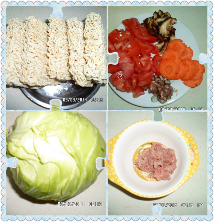 原料如上所示:泡面,包菜、西红柿、红萝卜、香菇、葱头、瘦肉。先把泡面放入水中洗一上,再泡水。包菜洗完切成细丝、红萝卜切成雪花片状、葱头切成薄片、香茹切成薄片、瘦肉切成丝加入适量的地瓜粉抓一抓。