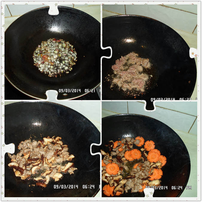 开小火,锅里放入适量的油。加入葱头炒香。再把葱头油装到碗里。再倒入适量的油,放入瘦肉炒一炒,再依次加入香茹、红萝卜片炒一炒。