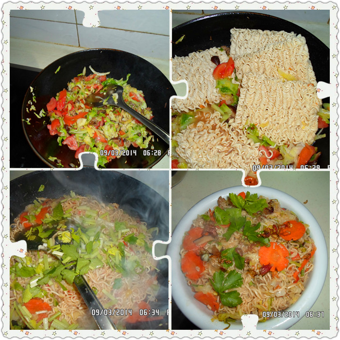 再依次加入西红柿、包菜炒一炒,再加入适量的水,把泡面捞出来放进锅里,炒一炒,再加入适量的盐巴和鸡精。把切好的芹菜放进去搅拌就可出锅了。装盘后再撒入之前炒香的葱头油,吃起来还是挺Q的,看来这面用炒的还是可行的。