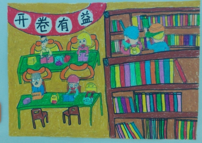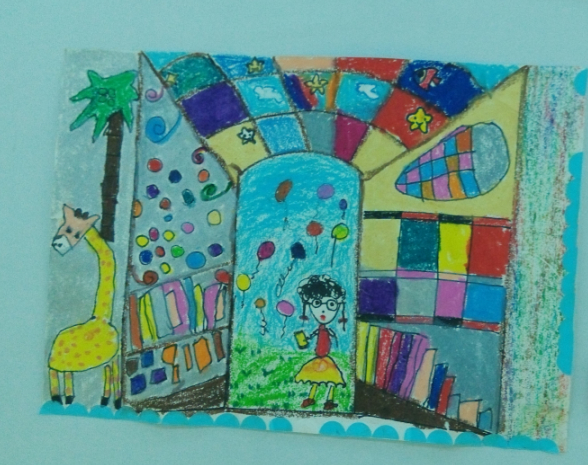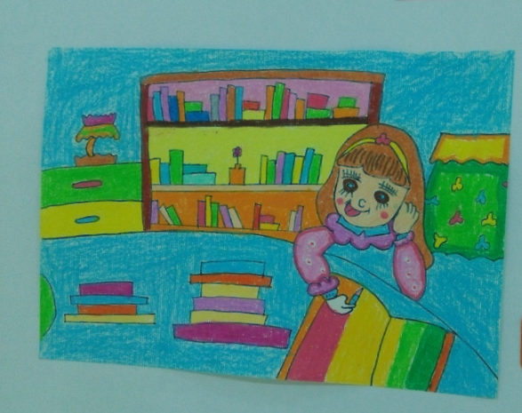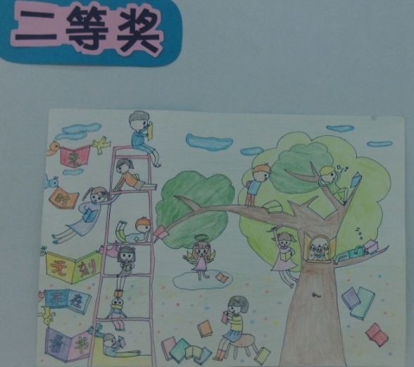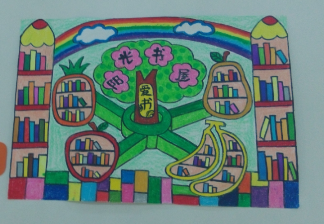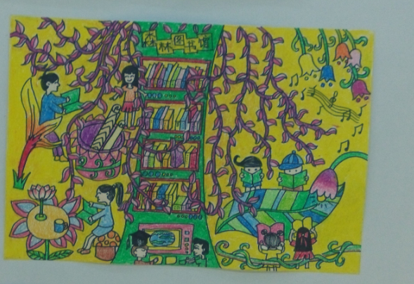 优秀奖中一幅小鸟图书馆很有意思,长颈鹿图书馆是点点很喜欢的。涂色都很鲜艳,能够表达孩子爱读书的心愿。