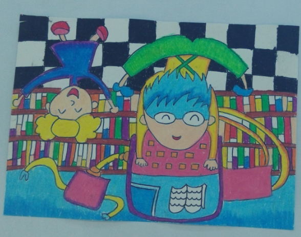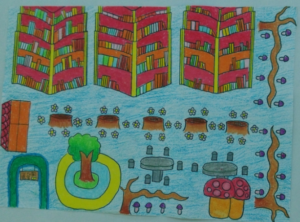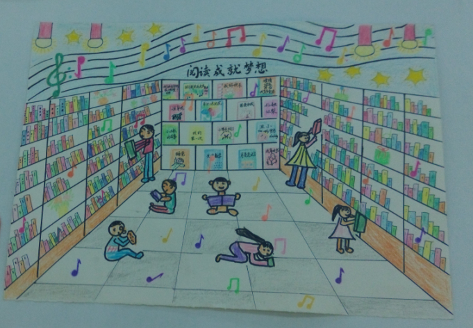 我们一起看了每一幅作品,一等奖的作品画得很不错的,尤其是第一幅作品,画出了图书馆的一个个场景,还有旧书回收呢,很注意环保呢,点点说上面的收银台也很像我们现在的收银台,很漂亮。第二幅作品是一个森林图书馆,小朋友们可以在树屋上面看书,很有想象力。第三幅作品是一个荷花图书馆,莲蓬书桌,荷叶做凉亭,小朋友们走在水里,坐在莲藕上面看书,很有创意哦。