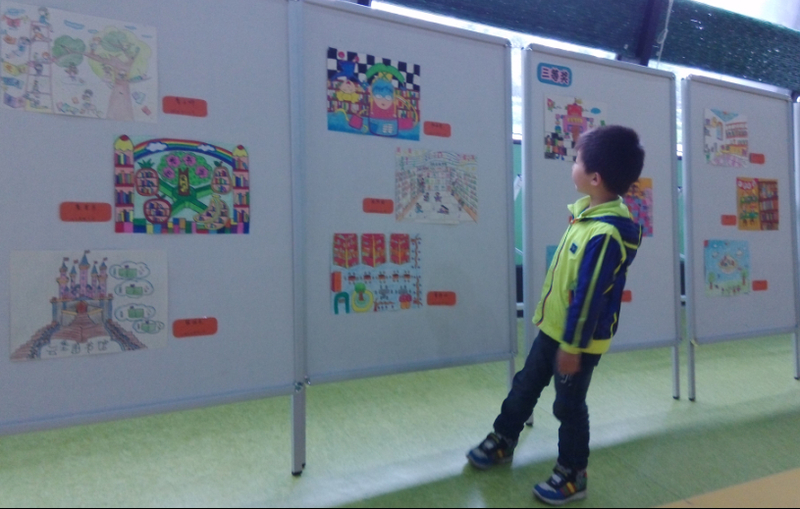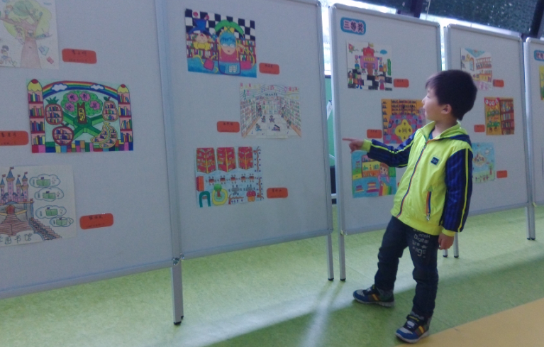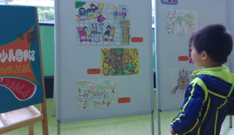 周末的时候,我们一起去图书馆借书,看到了我们的作品被展示出来了,点点的图书馆得了二等奖,点点一看见就指着自己的作品说,这是我画的,还和旁边的小朋友说,这就是我画的,好不好看?最后还要和自己的作品合影一下。