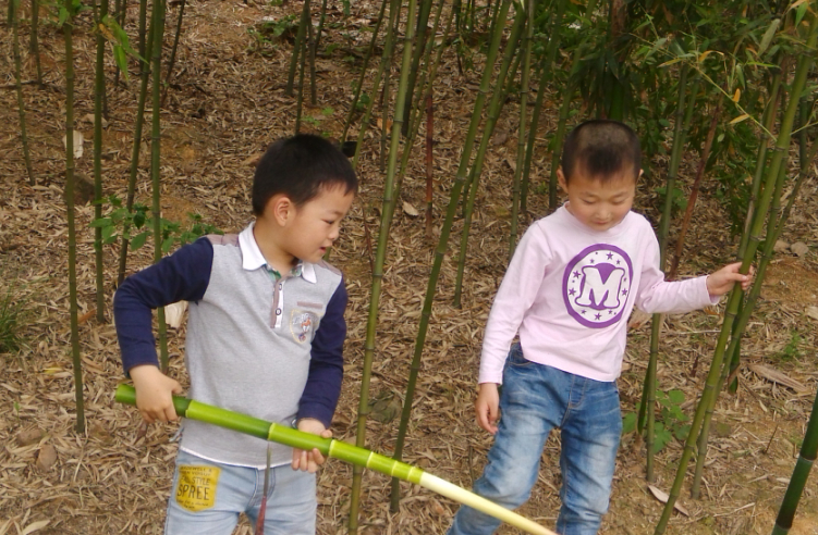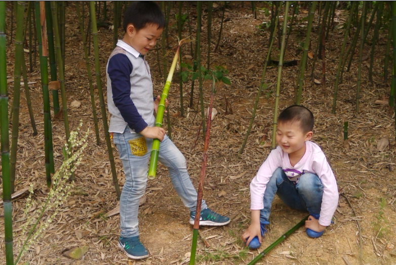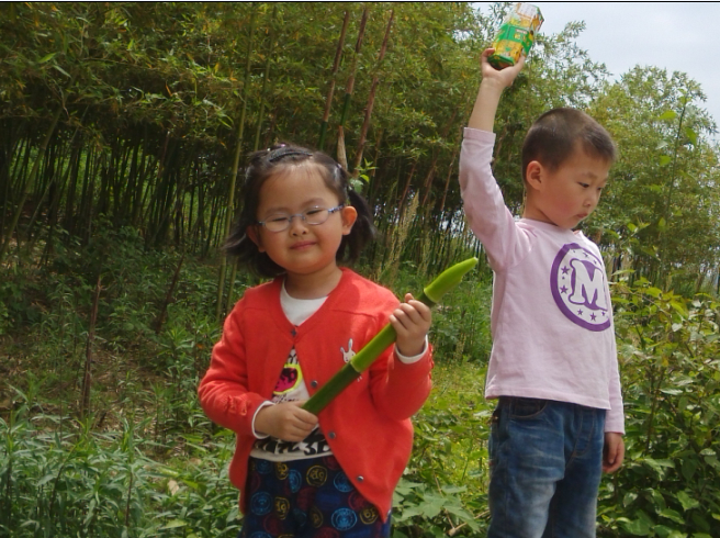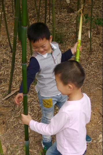 接着我们又回到野餐的地方,小朋友们还在一起表演节目,好玩极了,尤其是两个小弟弟小妹妹超级可爱的,手拉手一起走来走去,还一起去竹林探险,还没有进去,就说这里太危险了,我们回家吧。