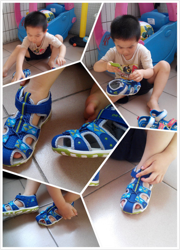 在孩子的期盼下,昨天朋友过来了,亲自把鞋送上来了,太感谢了!小羽有新鞋啦!不过前天我就告诉小羽,会在昨天把鞋拿回来,他却说先不要拿给他,叫我藏在家里,他放学回来就可以找鞋,他一定会找到的。我怕藏得太难,就放在鞋柜旁边的一个地方,果然他很容易就找到了呢! 看到这鞋,颜色是男孩子的蓝色,很漂亮呢!前年买过这样的鞋给孩子,好喜欢,天天穿呢!这鞋的质量好,穿一季是没问题的。而且之前小羽自己挑的那双凉鞋他不怎么喜欢穿了,说跑不快。这下,他喜欢这双了,说这双才跑得快。或许他知道这鞋穿起来更舒服吧!品牌就是比较普通鞋好呀!![]() 马上自己穿起鞋子来。这个码数对于他来说可能稍微大一点,不过穿起来是没问题的啦!哈哈,这双鞋真棒!今天早上就穿去幼儿园,说要给老师看呢!