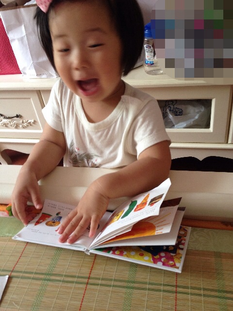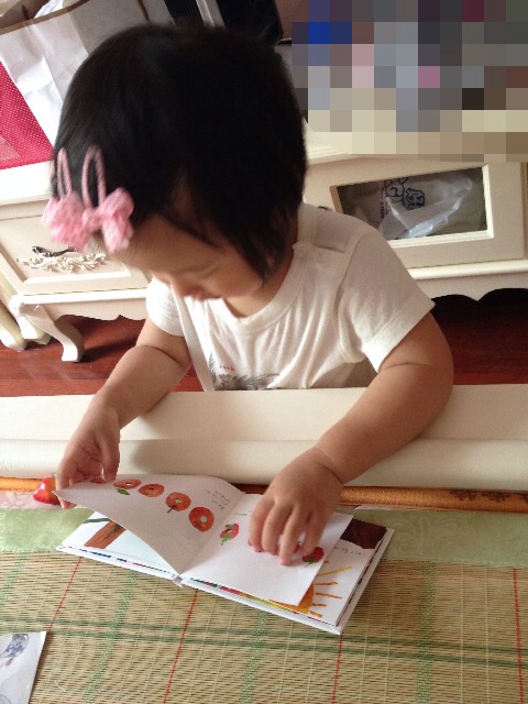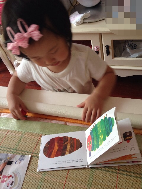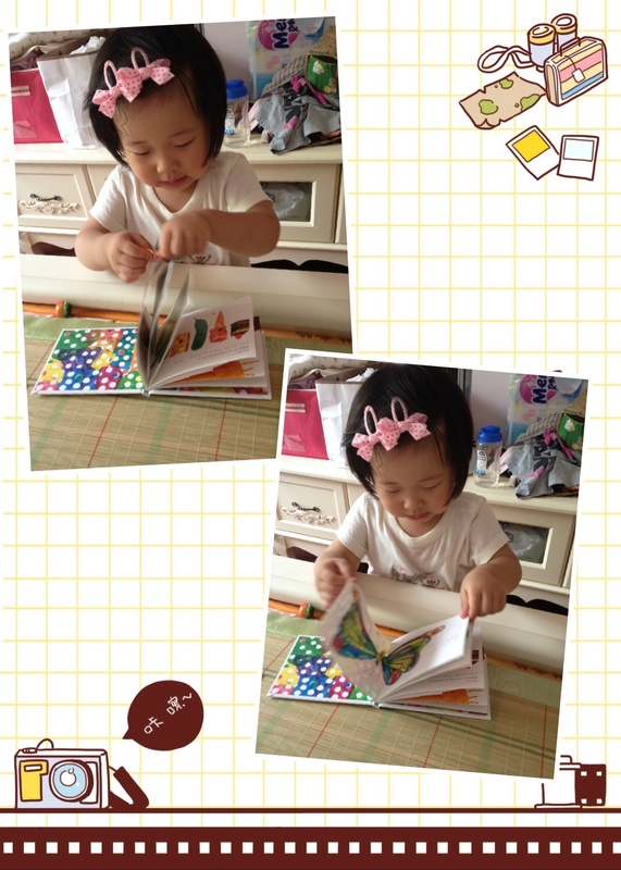 22个月的她已经从要我读,变成自己能把这本书完成的讲一遍了,即便是这样,《好饿的毛毛虫》小妞还是喜欢的每天要看,这次去日本旅游,由于这本书太大太沉了,没有带在身边,我和小妞都觉得有些许遗憾。