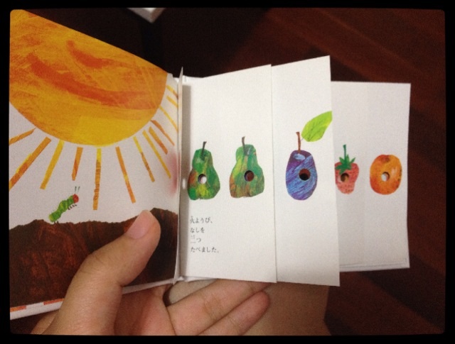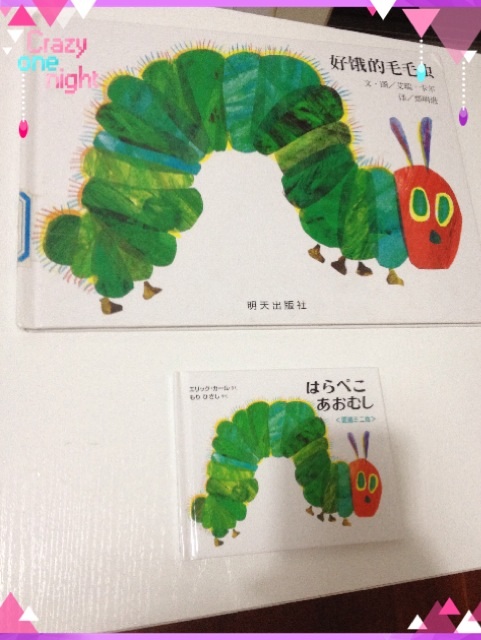 书的内容当然是日文,虽然我看不懂,但《好饿的毛毛虫》的故事情节再熟悉不过了,只要看图片就可以啦!