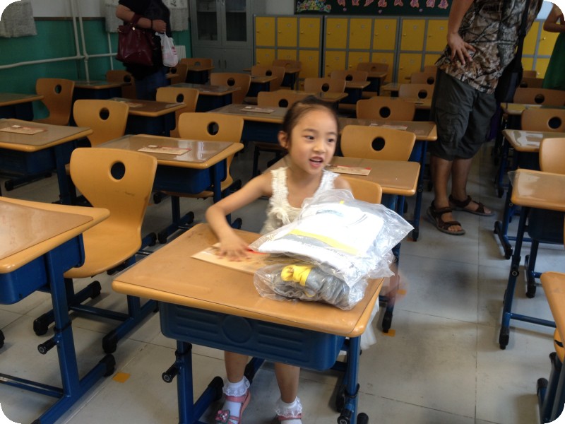 校服领回来了,共发了三套,一套夏季的、一套春秋季的、一套冬季的。 平时看惯了高中大孩子的课堂,进入这一年级的教室,还真是感觉迷你,低矮的桌椅是适合小孩子使用的,三十多套桌椅,教室后面还有给孩子们准备的小柜子,贝贝个子小,自然坐在了第一排。每周座位进行左右轮换,为了保护孩子的眼睛。上学这一个月来,除了正常的挪动,贝贝的座位被老师调换了两次,现在坐在第二排,她说是有的同学说话,老师为了把他们分开,于是就把听话的她安插进去了。
