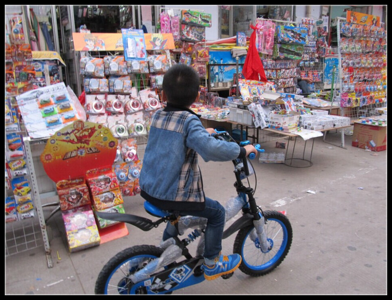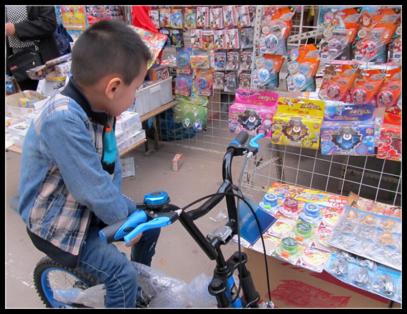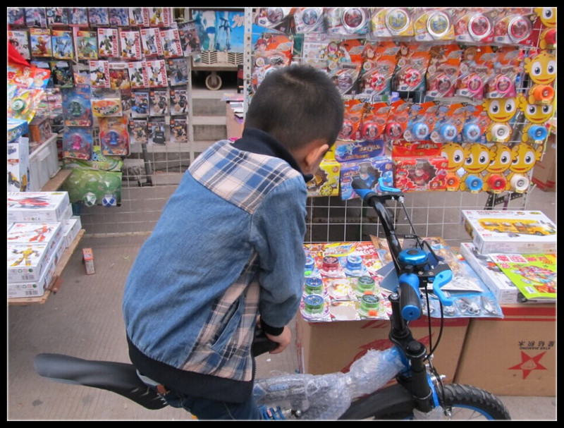 虽然我是个大人,但是也忍不住想看看最新流行什么玩具,不过貌似还是那些,无非也就是陀螺、悠悠球、拼装玩具等等。对于拼装玩具,Aric始终都很喜欢,特别是星钻积木家的。Aric刚开始的时候会拼一些小的,例如小变形金刚、小汽车、小工程车等等,而大的就需要爸爸来帮他拼了。这次我又看到星钻积木的玩具,竟然是大盒的,而且可以拼装成大的变形金刚。我是极为有兴趣的,问Aric要吗?Aric摇头说不要,自己又拼不了,爸爸太辛苦了。 看吧,Aric有时还是蛮懂事的嘛。到了钢琴学校我们放好了车,Aric突然意识到一个问题,就是他的自行车没有锁啊,如果丢了可怎么办呢?我说不知道啊,反正我有锁,你自己想办法吧。Aric问要不妈妈帮忙抬到教室里?我立马反对,这不是影响别人吗?Aric看这个要求不行又想了一下,当他看到我锁车时终于想到一个好办法,就是用妈妈的锁把他的车和我的车锁一起,怕我反对,他说自己试一试,然后小家伙把自己的车抬了过来,然后锁在了一起,才放下心头大事。 ![]() 别看咱在看玩具,可是咱不会去买哦。 ![]() 几家店的老板都好笑的问Aric要什么?Aric就会摇头说只是看看而已。 ![]() 看到最近貌似星钻积木好像挺火的,不过Aric挺有自知之明,自己拼不了,爸爸太辛苦,等爸爸休息以后再来买。 ![]() 小家伙的骑车技术那是杠杠的,哪怕一点小空隙,Aric都想尝试着骑过去。 ![]() 到了学校门口,Aric自己抬车和妈妈的车放在一起,这是要干嘛啊? ![]() 原来Aric想到一个好主意,就是用锁把妈妈和自己的车锁在一起,这样他的车就不会丢了啊。