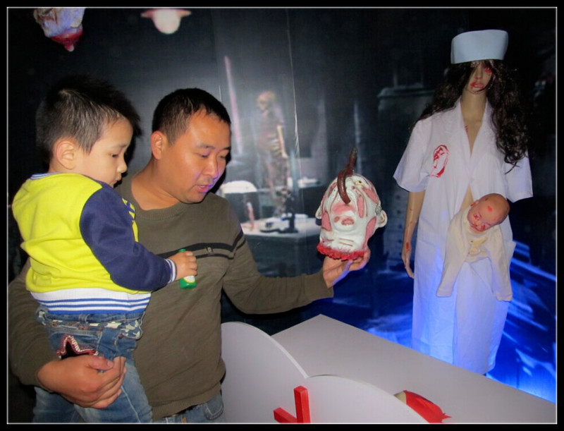 Aric刚开始看有些不明白,直到爸爸告诉他,这是因为护士阿姨吃掉了小婴儿,所以才是这个样子的。只听“啊!”一声,Aric趴进了爸爸的怀里喊着“赶紧走、赶紧走,太吓人了!”不过这护士的桌子上还有不少头呢,老公抓着拿起来吓唬Aric,Aric干脆把头转过去看别的地方。我刚开始也是有点害怕的,但是老公说这是软胶做的,我就去摸了摸,嘿,果然是软胶做的,就那骷颅头也是特别轻的塑料做的。 不过还没看完呢,Aric就跑了出去,时不时的站在门口往里面看,喊着“爸爸快出来啊!”而此时的老公在做什么呢?原来我很认真的拍照,没注意过身边,老公拍了拍我让我抬头看,只看我的脑袋上面,一只断手吊在上面,呜呜,吓死我了,心跳加速啊,赶紧跑了出去陪儿子,这种鬼屋还是不要进去的好,估计今晚会做恶梦了。一会老公才出来,还有些意犹未尽,说一点儿也不吓人。我和Aric瞪了他一眼,这人绝对故意的,哼。 ![]() 刚开始没开闪光灯,好黑啊。 ![]() 照片太多了,干脆就选了几张,不单独放了,合在一起吧,省的吓到人,哈哈。 ![]() 老公在研究那些可怕的头颅,Aric有些害怕,直到老公拿过来给他看。 ![]() “我不看我不看,我就不看!”虽然是软胶塑料做的,但是还是蛮逼真,很可怕啊。