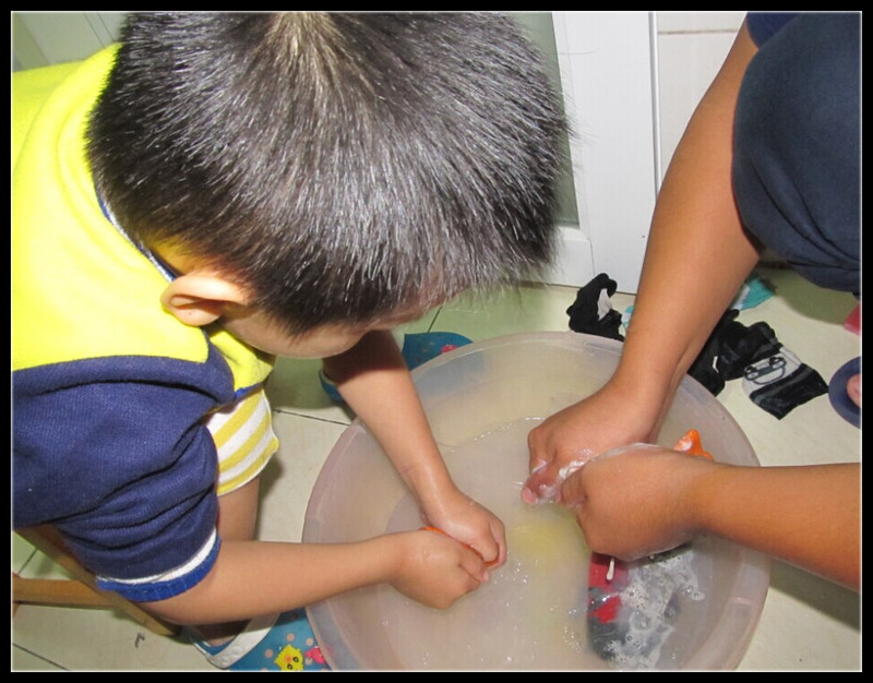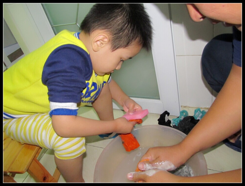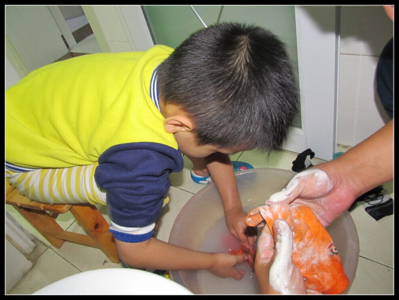 我发现对于孩子的教育与生活问题上,如果只有妈妈一个人来做,肯定是不够的,毕竟偶尔会有一些遗忘。好在老公经常会帮帮我,带带孩子,也给Aric做了个很好的榜样。这几天老公陪Aric做作业,给Aric洗澡,与Aric一起玩耍、做手工,昨晚又让我看到父子俩一起洗袜子,令我很感动。以前也跟老公说过让他多陪陪孩子,刚开始还答应的蛮痛快,不过后来就选择性遗忘,到Aric现在5岁多了,有了自理能力了,老公也出马了。 ![]() 因为天气冷了,Aric和老公每晚的洗脚改成了泡脚,刚开始老公都把袜子扔到卫生间里,让我每天都在各房间里转悠着,寻找该洗的衣服和袜子,不过后来我改成两天一洗,老公这袜子换的勤啊,天又冷,当天洗的袜子得两天才能干。老公就开始每天晚上泡完脚了顺便把袜子洗出来。这不,Aric看到了爸爸每天洗袜子,就说自己也想洗自己的袜子,老公是百分百的支持,于是父子俩每晚就躲在卫生间里,洗起了袜子。 ![]() Aric刚开始不太会洗,老公就手把手的教他,后来Aric可以自己洗了,不过洗的不干净,老公也不多说什么,帮他冲好了晾干,让Aric自己看洗的袜子怎么样。Aric是个有洁癖的小孩,当然就看不惯了,所以不用老公说,自己就把袜子洗的干干净净,每次洗袜子的时候,里里外外翻看,就怕哪里洗的不干净,洗完了以后再让爸爸检查一遍。这还不够呢,还得跑到我面前来,让我帮他再做一次检查,直到得到了妈妈的肯定才放心。 ![]() 冲洗袜子对于Aric来说,是个非常浪费水的行为,他喜欢用流动的水来冲洗。因为泡沫比较多,所以总是冲洗不干净。于是爸爸就告诉他,不用流动的水也可以冲洗的干净,只不过是多换几盆水而已,这可比用流动水要好得多。于是Aric跟着爸爸学习了一晚上,很快就找到了方法。洗完了以后,Aric就会跑到我面前,不等我说话,就扒掉了我的袜子,然后乐颠颠的拿给爸爸显摆,说要给妈妈洗袜子。好感动哦,不过宝贝,妈妈的脚好冷哦。 ![]() 宝贝洗好了一只袜子让爸爸检查,不过爸爸的要求也很高,所以帮助Aric又洗了一遍。 ![]() 瞧这父子俩一样的动作,旁边都是已经洗好的袜子,谁能知道Aric得一天换2、3次袜子啊,绝对的浪费。 ![]() 给咱家勤快而又暖心的宝贝点个赞,宝贝觉得洗袜子这回事,是很满足,又快乐的事情呢。