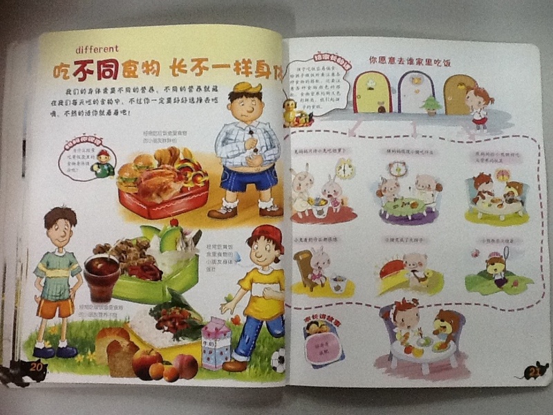 这本书的内容还是很丰富的,书中图文并茂,讲了人为什么吃饭,中国的小朋友不同的地区吃什么,外国的小朋友吃什么,动物吃什么,植物吃什么,有什么是不吃食物的,动物有各种各样的嘴,不一样的食物有不一样的餐具,吃不一样的食物,就会有不一样的身体,最后还有怎样吃的习惯,学会文明用餐。