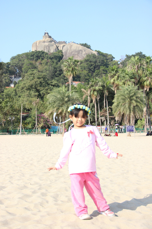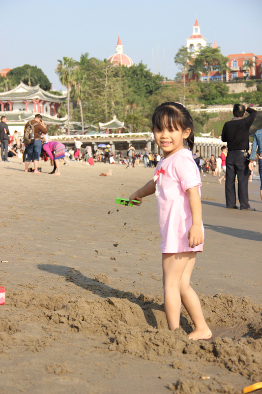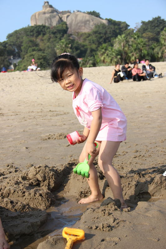 时间:2014年11月18日 地点:鼓浪屿 鼓浪屿,这里的沙子很细腻,玩沙的地方也很多,到处都可见一片片的沙滩,可是在前一天晚上一圈逛下来,还是感觉日光岩前的这片沙滩比较好,面积大,干净一些。因此第二天我们闲逛鼓浪屿后依然来到这里玩沙子。 当天气候适宜,于是宝宝只穿了小短裤,这样玩起来会更方便一些。一到达目的地立刻进入战斗。宝宝这是在用脚来挖土吗?呵呵,我也总这样玩,确实很有趣,沙在水的浸泡下很柔软,所以嘛,用脚去挖也不会伤害到宝宝的小脚,不过,还是略有一些吃力的。 看看孩子们的劳动成果,一个大的储水坑就造好了。宝宝正在为胜利而欢呼呢。 还还够,再用小耙子挖得深一些吧。 哈哈,我们的储水系统真是不错,海浪路过后便在其中留下了海水,这样就可以很方便的取到水了。 不过,海水一来,这储水坑就会遭到一次破坏,海水的力量还真是大呢。那么我们想要与之对抗,只能是继续巩固我们的阵地呀。两个孩子一起加把劲吧。