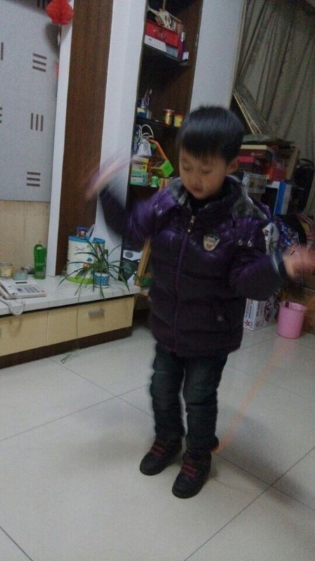 看着大人跳,不肯学跳绳 最开始的时候,点点爸爸教点点跳绳,点点怎么样也是不会跳,绳子甩过来了,点点的脚还没有跳过去,总是手脚不能默契配合,第一天不会跳,第二天还是这样,点点说在幼儿园里面也是这样跳不过去,点点就不愿意跳绳了,就看着爸爸妈妈跳,自己就是不跳。第三天我改变了策略,用原来的细绳改成了麻绳,塑料绳比较轻,很难甩过去,麻绳重,就比较好甩起来,这样就很容易学会了,用了麻绳点点总算是跳过去一个,这样点点就愿意跳了,每天都是这样一个一个跳,怎么样也连不起来。