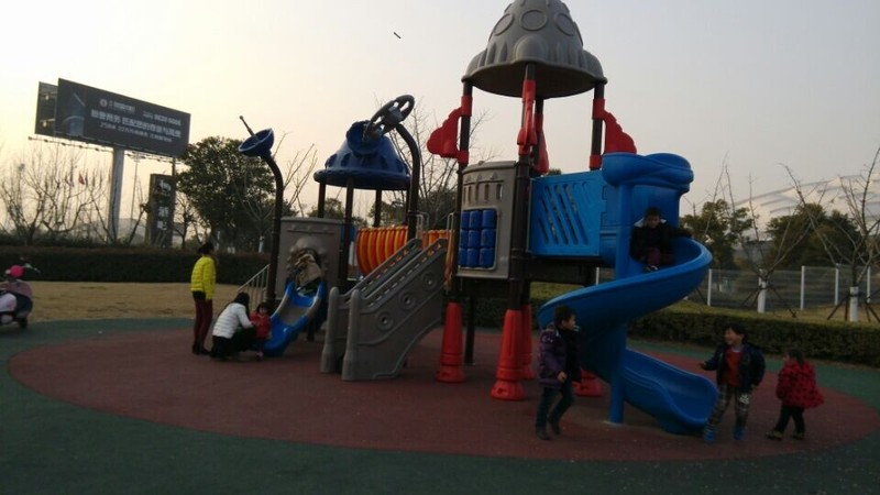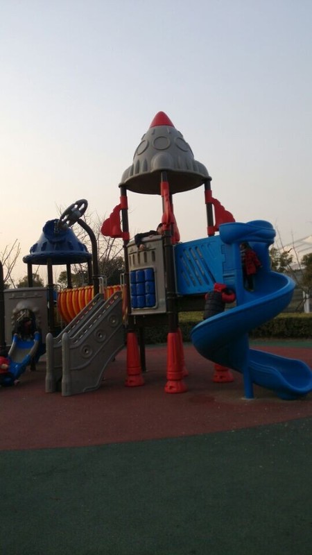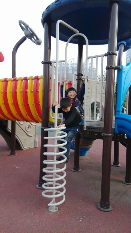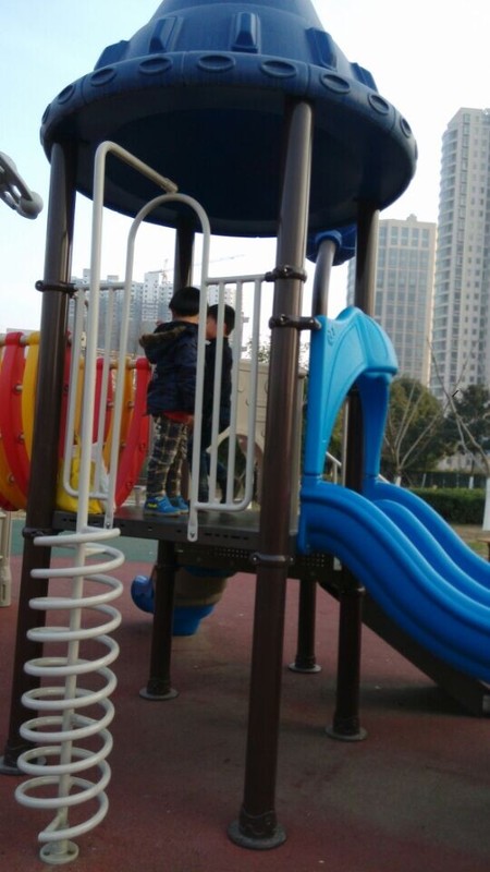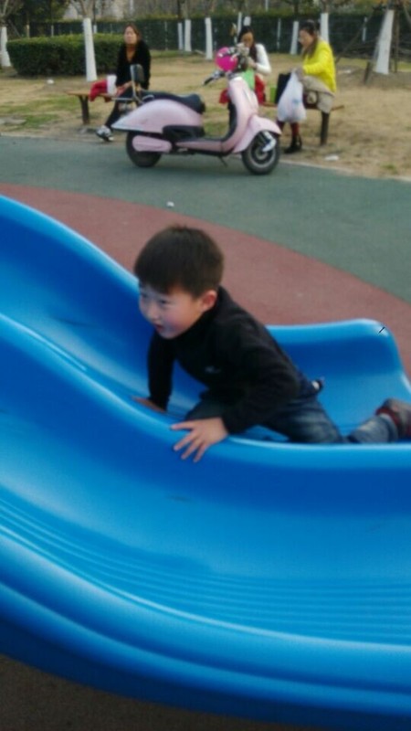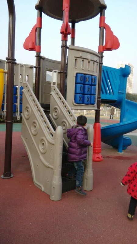 听完故事,点点就说要和同学一起去图书馆后面的游乐场玩,说是一个游乐场,就是一个室外的滑滑梯,很多小朋友在这里玩滑滑梯呢,点点同学的爸爸把我们带过去,然后就在这个滑滑梯区域疯玩了。因为玩的小朋友蛮多的,他们都可以玩到一块儿。点点和sky玩滑滑梯,看谁先到滑滑梯的顶上,别看sky小朋友人小,可是很灵活呢,一溜烟儿就到了顶上,点点总是比他慢半拍了,点点的活动能力不是很强,所以和sky在一起玩挺好的,可以提高点点的活动能力。