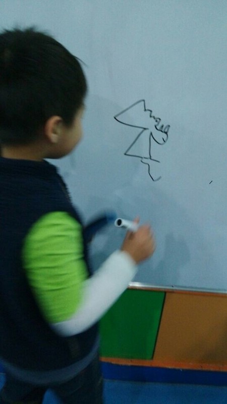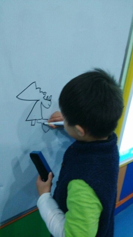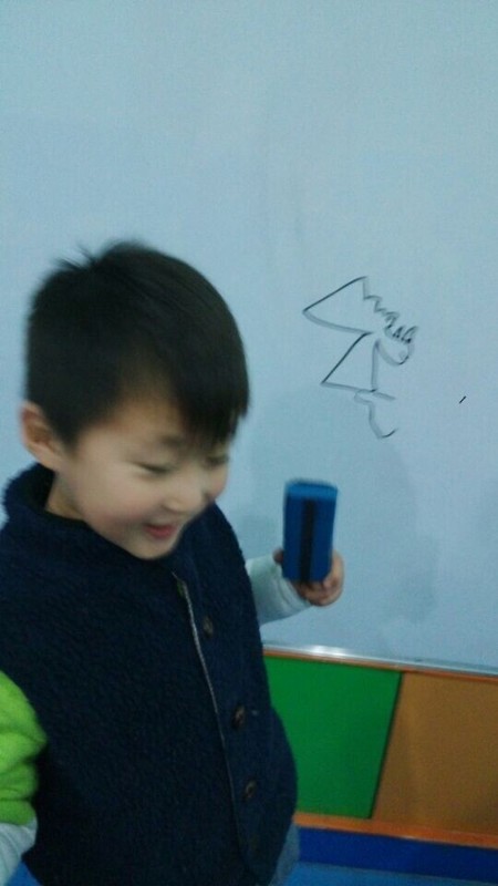 这个星期我们去上英语课,英语课的规矩比较少,教学环境很宽松,所以我们点点很喜欢去上英语课,在课前老师会和小朋友们一起玩游戏,和小朋友们打成一片,点点就喜欢拿着老师的白板笔在黑板上画画了。