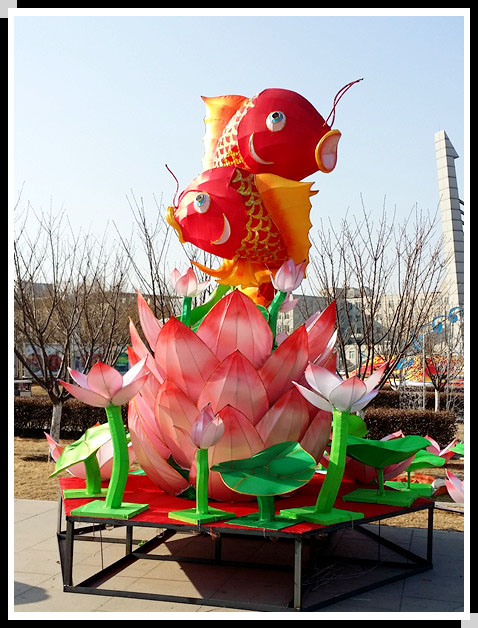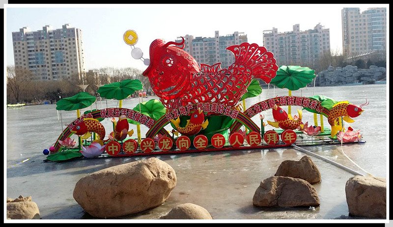 前几天带宝贝去公园玩的时候竟然惊喜的发现公园里冰场上面居然出现了好多的花灯,这可是第一次在公园里看到花灯呢!当时的花灯正处于安装的状态中,施工人正在紧张的忙碌着,也有一些花灯已经完工,看起来好漂亮的,节日里因为有了花灯的点缀更加的热闹而美好起来。而且很有年味的,公园里呈现出一派喜气洋洋的欢庆场面,吉祥花灯,快乐新年! 妈妈找了些完工的花灯拍了拍,这些花灯应该都是由不同单位赞助的吧,每一个花灯都有一个宣传该企业的主题。首先映入妈妈眼帘的就是这个大花灯了,红色的鲤鱼很喜庆也有个很好的意头,年年有余,大吉大利,这是每个人,每个家庭都期盼的。绿色的荷叶应衬红色的鱼儿,而且还是置于冰面上,此景看起来甚是美丽。想想如果这些花灯都已经装置完毕,晚上点灯后公园里该是一幅怎样的祥和美景呢!