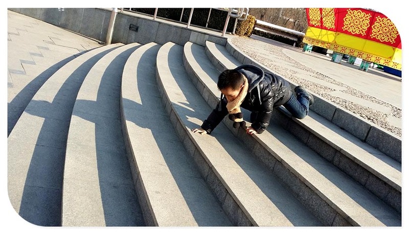 此时当妈妈让小家伙跟红鱼合影的时候, 看看这娃在干啥,人家正积极的爬台阶玩呢,淘气的孩子!