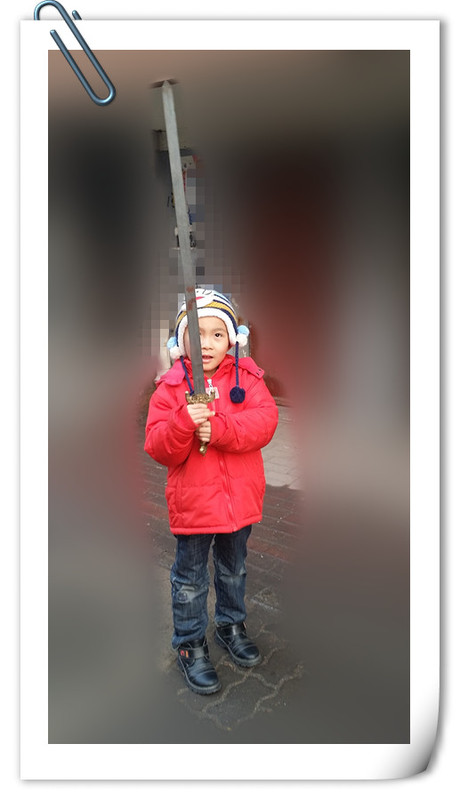 小家伙发现好玩的了,旁边有个马葫芦盖子,上面有个洞可以插入宝剑玩。妈妈故意逗小家伙说“小心剑掉下去拿不出来啊”,孩子却回答到“这个掉不下去的,宝剑上有把”,呵呵,不错啊,有自己的观察,不是听啥是啥。小家伙双手举起宝剑插入洞口,对准的时候是小心翼翼啊,而且宝剑完全插入其中的时候相当高兴,好像完成了一个比较特别的体验似的。