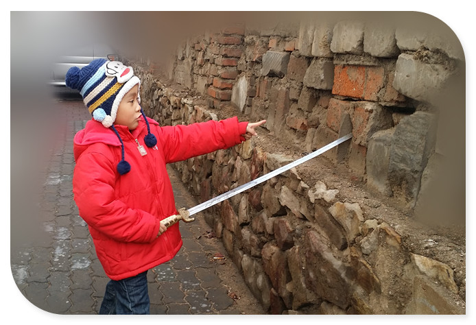 这是一面比较原始的墙了,小家伙拿着剑往墙上的缝隙处插入,后来还发现了比较宽敞的一处,孩子兴奋的喊道,这个一定是老鼠洞吧,然后举剑插入其中,嘴里还念念有词的说道“看你往哪里跑”,看孩子一副认真的摸样跟真事是的,其实就是自己玩在其中而已。要是老鼠在这里安家,估计不是冻死就得饿死。不过有了情节的游戏玩起来则是变得有趣起来。后来姥姥出来喊小家伙回家吃饭喽,我们的宝剑玩耍到此结束......