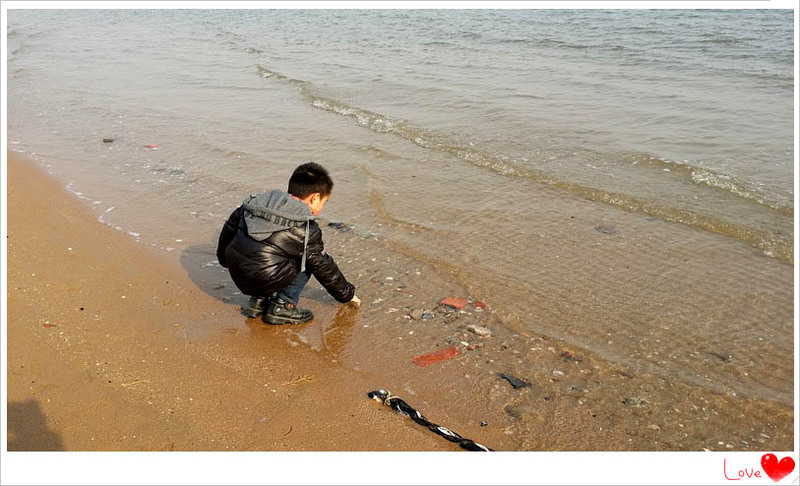 之所以选择海边就是因为这个小家伙总是惦记着能够下海玩水,非要把夏天能做的事情提前到冬天,即便现在是春意盎然想要玩水也是不行的啊!尊重小家伙的想法,让孩子自己去感受海水的温度,让孩子自己去决定是否可以下水玩吧。蹲在岸边,小手摸了海水才打消了要脱鞋光脚丫玩水的念头。