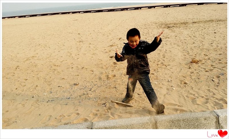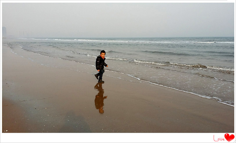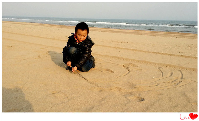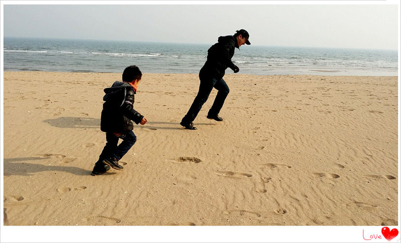 玩水不成,玩沙可以。沙滩上抓沙一把后小家伙把腿就开始跑起来,人家是要追上跑在前面的爸爸呢,小家伙又要玩扔沙子的游戏了。看儿子跑过来老爸也加快了速度,可不能让臭小子得逞。后来的扔沙玩耍中宝贝也有得逞的时候呢,还以为不在玩这个游戏的爸爸和妈妈的暂时放松就会让小家伙钻了空子,不免要挨些沙子了。不过由于后来风很大这个玩沙容易眯了眼睛只好宣布停止喽!写贴在看照片的时候,突然满心充满了爱意,很温馨,很幸福。