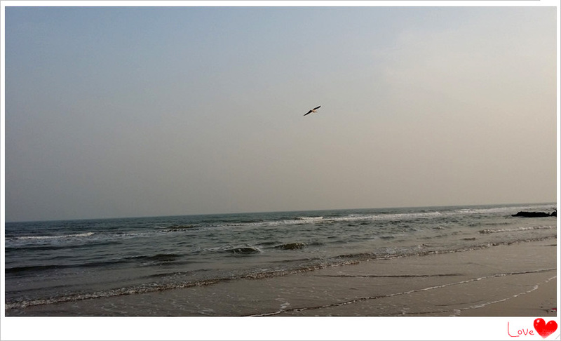 宝贝跑向海边,远远的拍了一张 下面飞翔海面上空的则是海鸥......