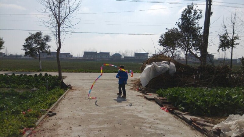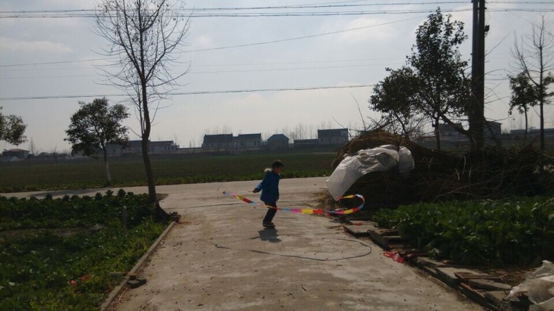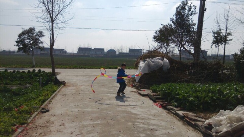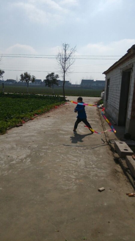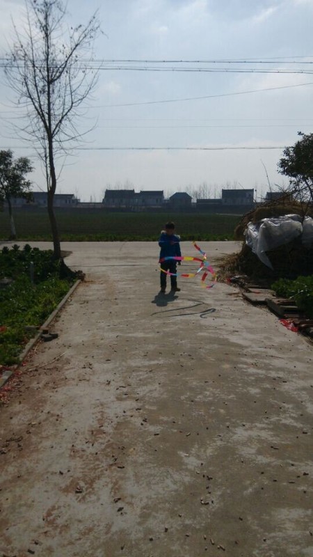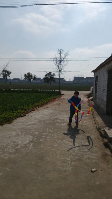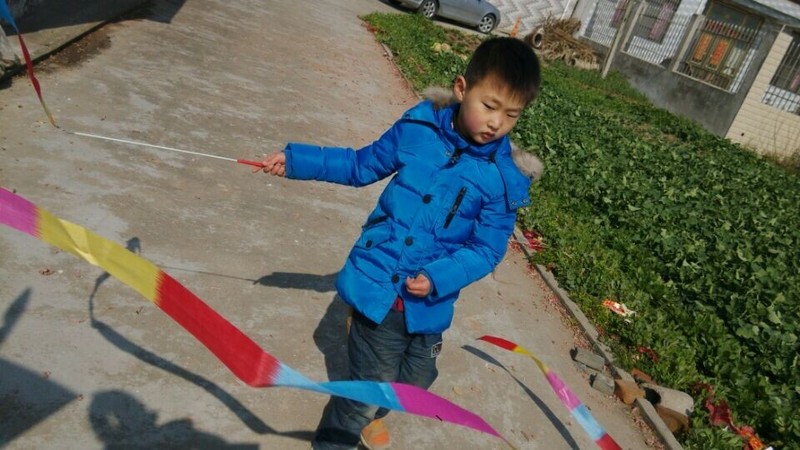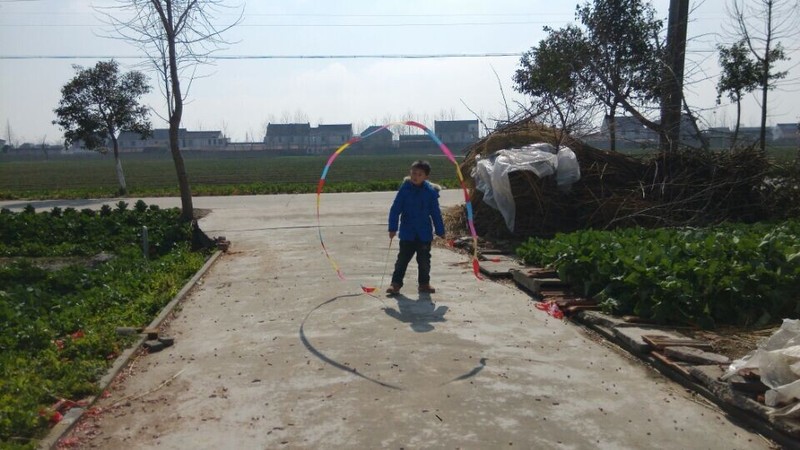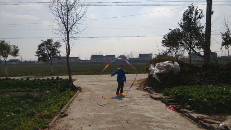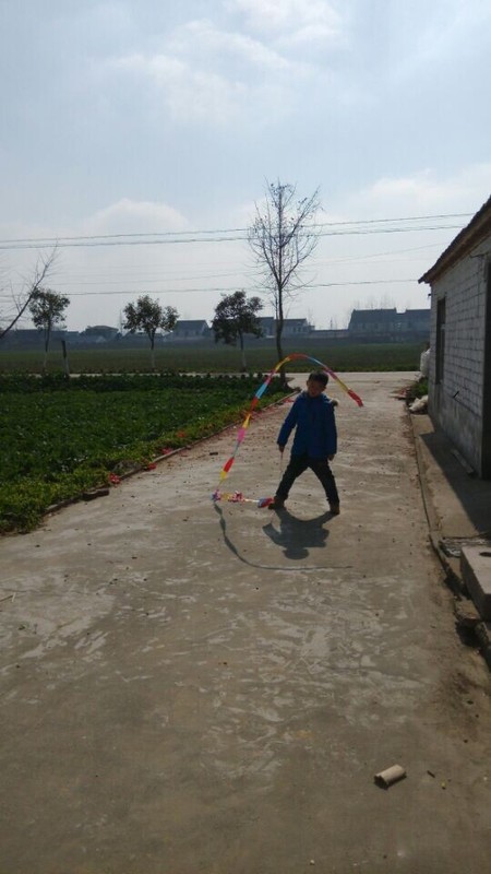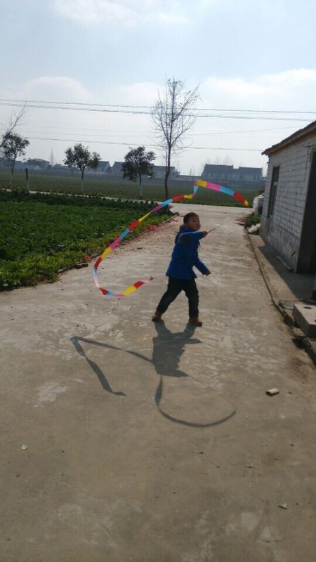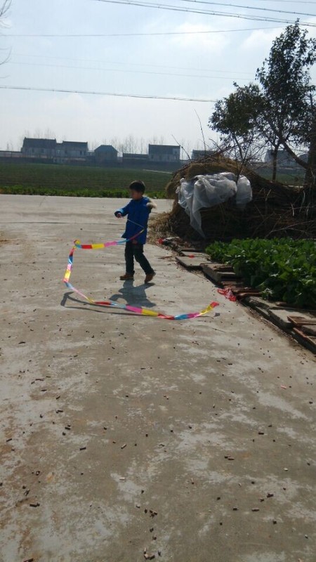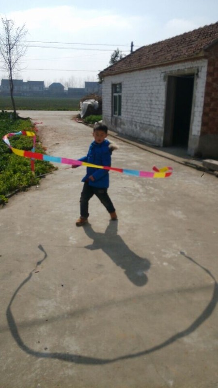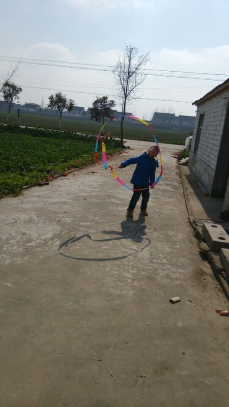 到了乡下,天气还不错,点点拿出彩带就在爷爷奶奶面前炫耀,说自己很会舞彩带,乡下门口的场地比较大,点点拿起彩带甩起来,一开始甩得并不是很好,不成形状,点点就说这个彩带怎么那么不听话,我想要它变成圆形怎么就乱了呢?我安慰他说,只要多练习就好。点点练习了一会儿,甩起的彩带就飞舞起来了,真的变成了圆形了,一圈一圈的圆弧形,很漂亮,在太阳光的映照下,显得光彩夺目,点点就在彩带间迅速走起来,速度越快,彩带飞起来越漂亮
