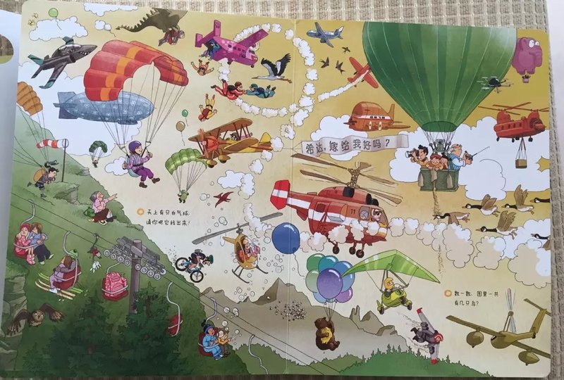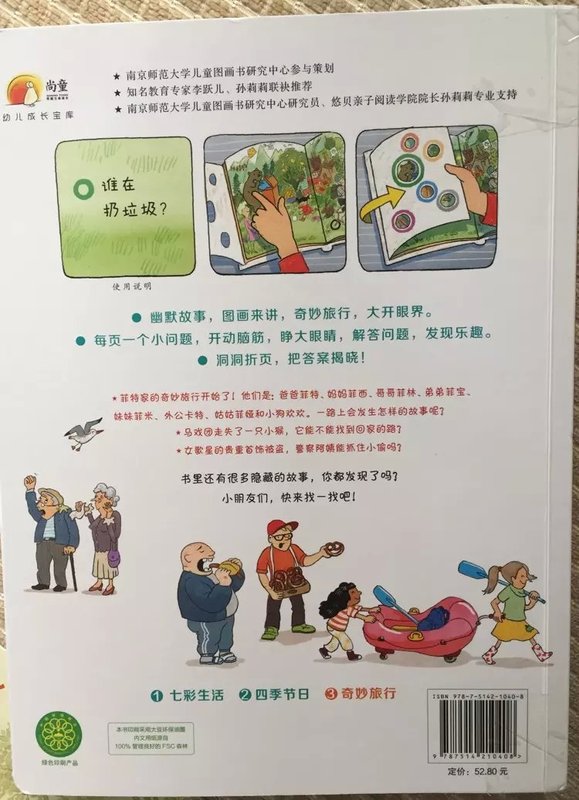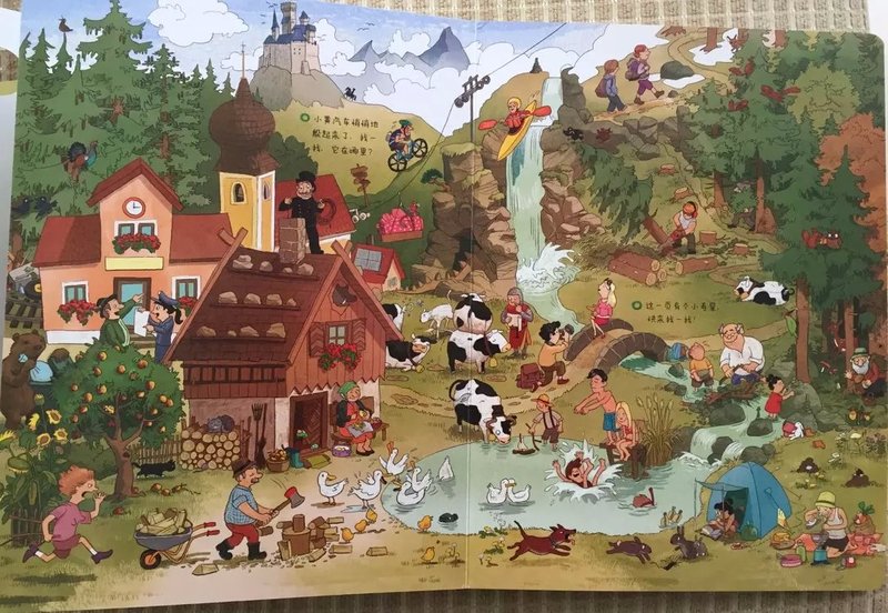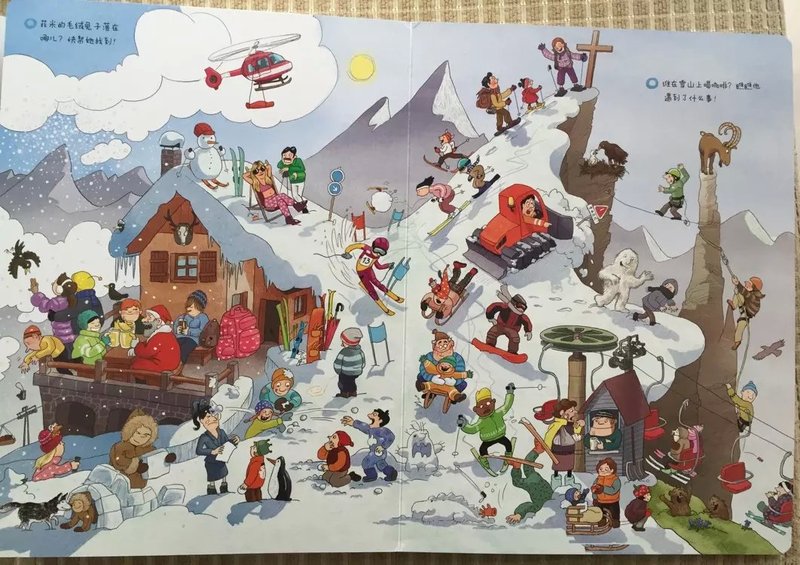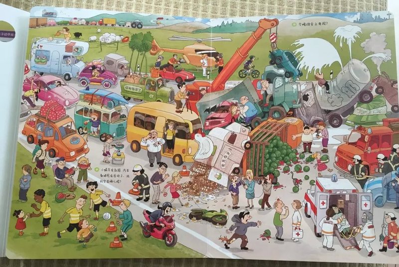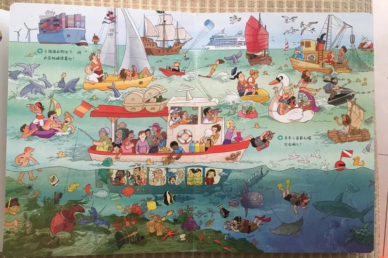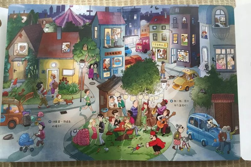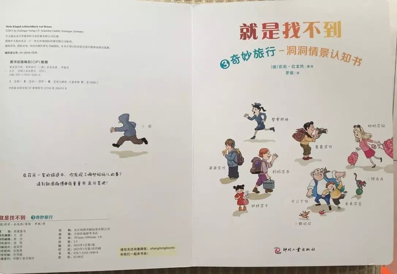 ——读《就是找不到》系列 《就是找不到》系列很早的时候就在微信上看到过这套书的影子,当时仅凭着书名和封皮上‘洞洞情景认知书’的定义,我以为这又是一套类似《视觉大发现》或者《眼力大考验》之类的洞洞游戏书。真正接触后,才发现真的是被震撼到了。这应该是我和宝贝接触到的最有意思的书了,它有洞洞书的特点,也有《眼力大考验》的精髓,更有无字故事书的魅力。 全书采用大开本设计,绿色环保印刷。全景式图画,贴近生活的场景,非常亲切,内容也非常丰富。这套书一共三本,也就是三个主题——《七彩生活》,《四季节日》,《奇妙旅行》,内容场景几乎涵盖了我们日常生活的方方面面。分享一下我收到的这本《奇妙旅行》,三本书中我还真的是最爱这一本。 ![]() ![]() 如果你拿到书粗粗地翻一下的话,也许你不会觉得有什么惊艳的,但是当你和孩子一起细细地在图画中捕捉的话,你会发现很多很多的惊喜。书的前后封皮采用洞洞折叠页设计,而这些洞洞又大小不一,颜色各异,排列也没有规则。书中每一页都采用硬纸板设计,每一页都有一个问题等待小朋友去图中寻找答案,除此以外,书中再没有多余的文字。这种全景式大开页设计,内容之丰富,绝对会让孩子大开眼界。在寻找答案的同时,对孩子的观察力也是一大考验和锻炼,更是锻炼孩子的专注力。 ![]() 书中没有任何一个问题的答案,想要找到答案,除了努力在大开页全景图上找之外,还有一个很简单的办法。嘻嘻,那就是把洞洞页覆盖到对应的页面上去,让孩子根据问题在不同的洞洞套住的图画里去确定答案,这种设计够特别,够有趣吧? ![]() ![]() 无字书,以前也接触过。这套书给我的感觉是,除了 趣味和互动游戏外,其故事性一点都不输无字绘本。而因为它的全景式图画,其中的事物和场景之丰富,绝对是非常适合孩子的情景认知书。这本《奇妙旅行》描述的是菲米一家去旅行的故事,每一页上都有他们,或是主角或是配角,贯穿全书,成为故事。而另外一个隐藏的故事,就是警察阿姨追小偷。 ![]() 小偷和警察阿姨也在每一页都出现,只是隐藏很深,那么大的全景图画里,想要找到他们也是需要眼力的,哈哈。小偷因为偷了歌剧明星价值不菲的桂冠,遭受到警察的追捕,他们就这样跟随着米菲一家的旅行,一个追,一个躲。看懂了这个故事,孩子感觉太有趣了! 更赞的是,书中每一处的人物表情都刻画得惟妙惟肖,非常真实。画工真的是太细致了! ![]() 书中我们跟随着米菲一家也展开了奇妙的旅行,嘈杂的火车站,汇集各种各样人物的火车厢,原生态的山林小镇,欢乐无比的滑雪场,high到爆的空中飞行,美妙的沙滩和海底世界...... 别说是孩子了,就是我看着都感觉大开眼界,完全被这丰富的画面吸引了。各种场景,各种交通工具,各种人物特点,画得都非常细致。仔细看,图画中每一个细节处理得都很好,即使是图画边缘处的人物和场景都刻画地非常生动,真的是费心了! ![]() ![]() ![]() 收到书的第一天,我和小家伙边看边说,边找边回答,真的是玩得不亦乐乎,足足看了一个多小时,接着又看了三天还是感觉不够,小家伙说今天晚上还要看,哈哈。小家伙不时地会对着图画书中的世界感叹:“哇!酷啊!”看到米菲一家返家途中,发生一场交通事故那一页,看到一个人坐在已经爆裂的牛奶运输罐上大喝牛奶,小家伙乐得哈哈大笑:“笑死我了,太好笑了!',乐得直拍腿。 ![]() ![]() ![]() 而我们也在这一遍又一遍的翻阅中,让孩子认识到了很多新奇的事物,比如各种形状各异的飞行工具,各种形状的海上交通工具,以及各种各样的深海鱼类...... 而在一次又一次地让孩子给我看图说话,让孩子根据图画内容给我讲故事,对于孩子的语言表达和想象力也是极大的锻炼和提升。而每一次看,我们都会惊异地发现更多隐藏在图画中的故事。 ![]() 书的最后,米菲一家经历了一次奇妙的旅行,见识了不同的风土人情,领略了各种探险,最后愉快地回到家中;而偷了歌剧明星桂冠,屡次犯案的小偷也被穷追不舍的警察逮到押上警车,歌剧明星的桂冠也终于失而复得。 这样一套集洞洞设计和视力考验与无字故事于一体的全景式认知书,真的是名不虚传,值得推荐给所有六岁以下的孩子们。 本作品未经作者许可不得转载,转载请征求作者意见。擅自转载使用,将保留追究其法律责任的权利! 个性签名
