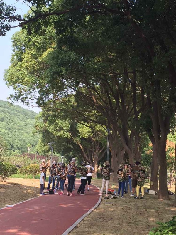 走过一片小树林,我们来到另一条小道上,点点看见一群人拿着枪,我猜可能是真人CS打仗游戏,于是点点就蹲下来看他们打仗了,一个指挥员在讲解怎样用枪,怎样被打到算是死了,点点听得津津有味,他们去打仗了,点点还跟在后面去看,据说那些枪都是真的,射程都在三四十米远,而且很精准的,近处对准脑袋打枪,远处对准胸脯打枪。后来他们正式开始打了,点点才离开的,点点说长大了也要参加这样的游戏。