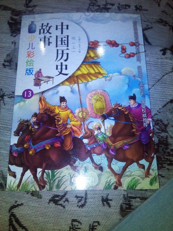 《中国历史故事少儿彩绘版》是写给孩子的启蒙历史读物,由百家讲坛著名学者毛佩琦、纪连海、孟宪实、蒙曼四位权威历史学家联合推荐。我收到的是第13册,讲的是明朝的历史。 原谅我历史不好,说道明朝我只知道朱元璋、朱允文、朱棣,其他的基本就不清楚了。这本书就让我很好的了解明朝的历史,而且是给小学生看得,就是很通俗易懂了,没有那么枯燥,也是让人很感兴趣的。