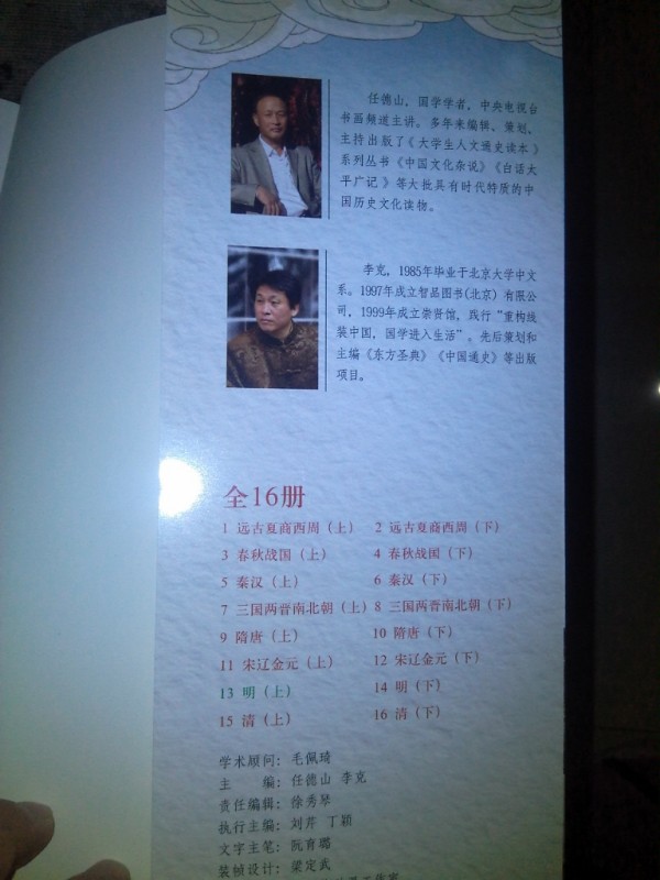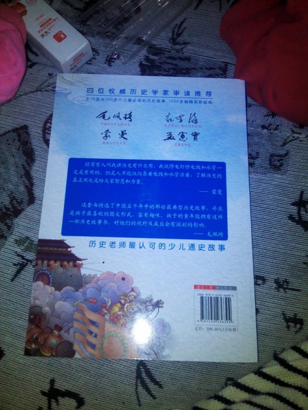 记得上星期参加分享的时候,老师出现了还不知道,还以为老师还没来,老师的名字真是太特别了——瓶中狗,就是不知道有什么深刻的含义啦,(*^__^*) 嘻嘻……第一次听瓶中狗老师的分享,觉得这位老师很是特别,而且也是非常的认真的。 这套《中国历史故事少儿彩绘版》,一共16册300个儿童必读的历史故事,并穿插讲解了小学生必须掌握的成语典故和历史百科。全书讲述了从远古尧舜禹时代到一直到新中国成立的历史,内容丰富广泛。