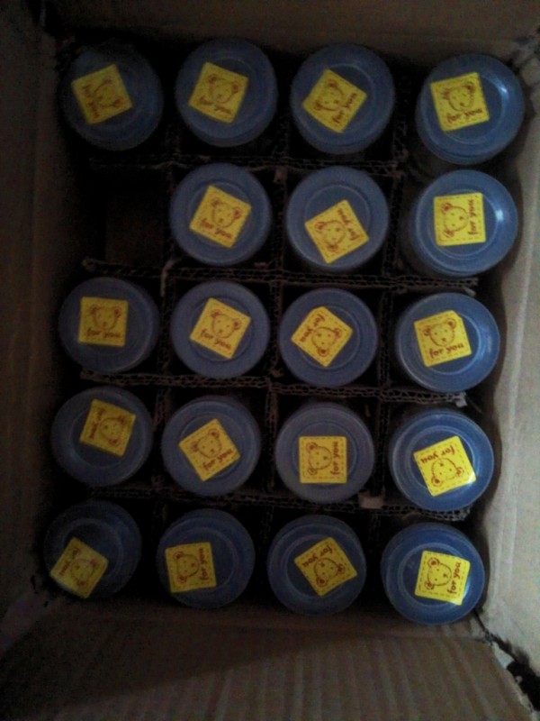 等了几天接到快递的电话,是老妈带着儿子去拿的,结果等女儿醒来后,我下楼一看,很无语,小熊贴纸被儿子全部贴在了玻璃杯盖上面,棒棒糖的封口贴那是到处都是,儿子的自行车坐垫上面,滑板车上面到处都是,有种想K他的冲动。问他为什么这样?得到的答案是:好看啊。我欲哭无泪啊,这熊孩子。而且送的木勺子和不锈钢的勺子也被这小子贴上了。 杯子真的好小巧,好可爱啊,我对100ML没有什么概念,看着这玻璃杯,真的是很小啊,家里的酸奶都被儿子吃完了,我还没有用,不知道这杯子能够用多久。儿子看到这么点大还挺喜欢的,这两天拿了一个杯子来喝水,用着还不错,喜欢。